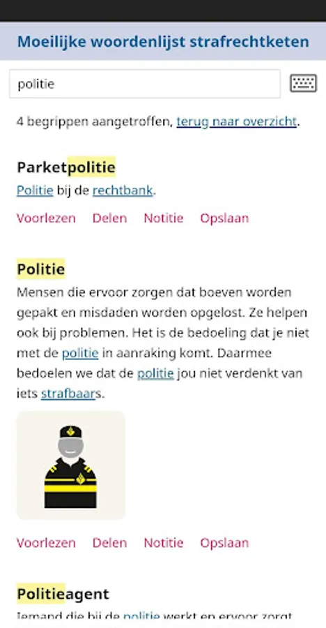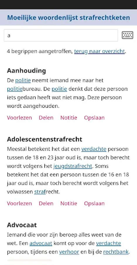 In the Difficult Glossary of Criminal Justice Chain, frequently used concepts from the criminal justice chain are explained in comprehensible language. This app is suitable for anyone who has difficulty with legal concepts and for professionals from the criminal justice chain who work with people with a mild intellectual disability. The app is part of the Basic Criminal Law Chain Tool.