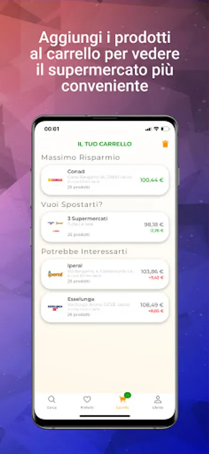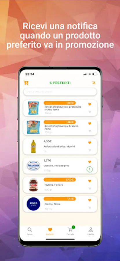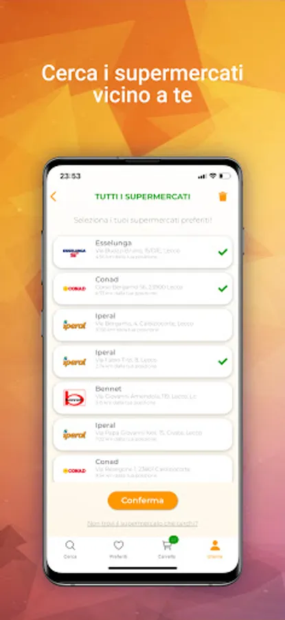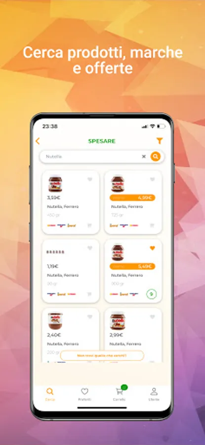 Spesare notifies you when your favorite products go on sale in supermarkets near your home. In addition, it advises you in which supermarket to go shopping, indicating how much you will spend and how much you will save in each of the chosen supermarkets!