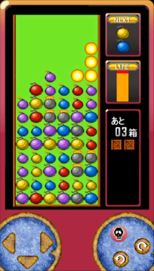 If you have 4 bombs of the same color vertically and horizontally, they will explode and take damage!
