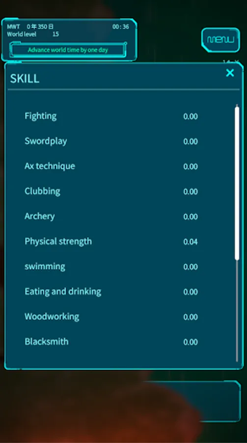 Numerous skills including fighting, crafting, gathering, swimming, eating, etc.