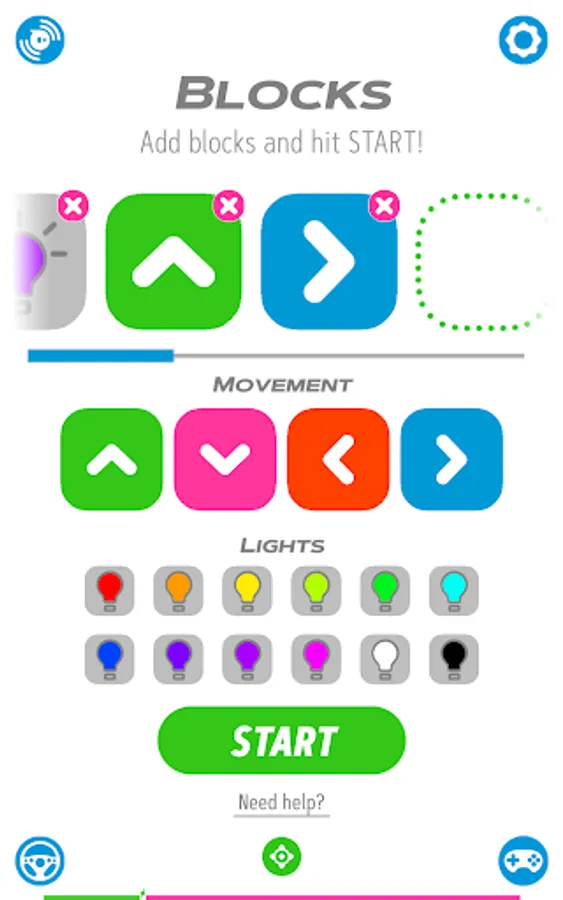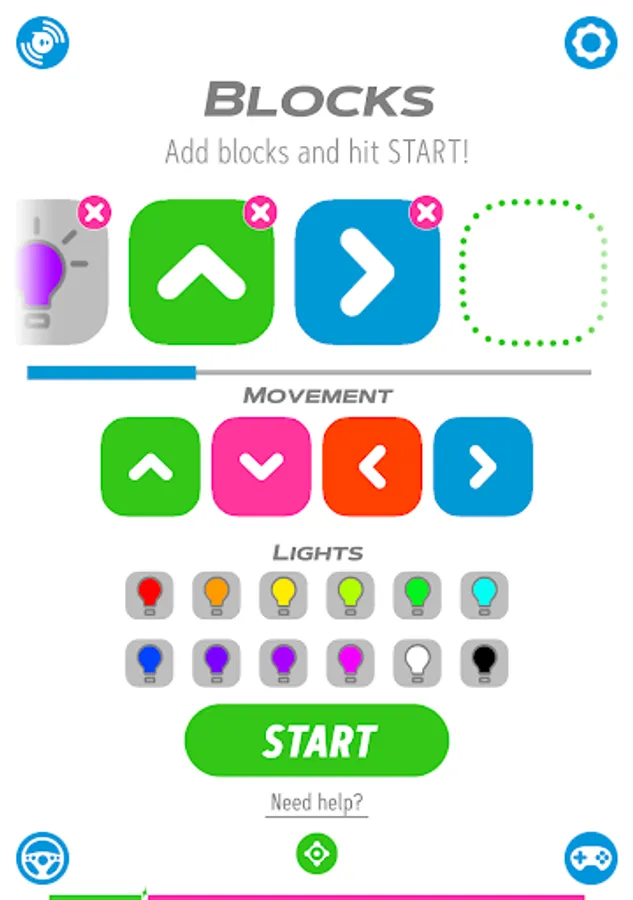 Learn programming basics by controlling your robot with colorful movement and light blocks.