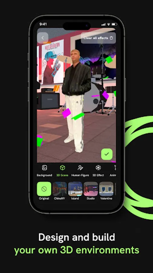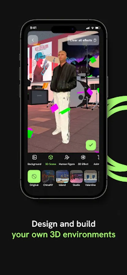 Design and build your own 3D environments, capturing and reliving unforgettable memories along the way. Adjust your avatar's size, add your choice of background, and bring your avatar to life with a range of visual effects. Complete your creation with a soundtrack from our library and get inspired by videos in the Spherum app.
