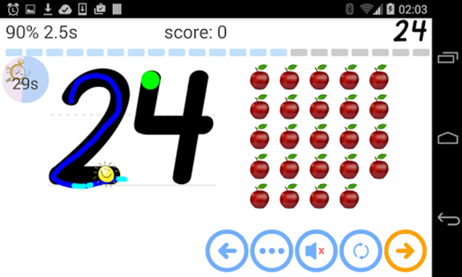 Digits and numbers tracing game that keeps children engaged and practicing through gamification of this boring task. The game includes 15 levels, each emphasizing various aspects of writing: accuracy, smoothness, speed of writing. Each digit comes with dynamic instructions. The writing accuracy, smoothness and speed are evaluated and children receive feedback.