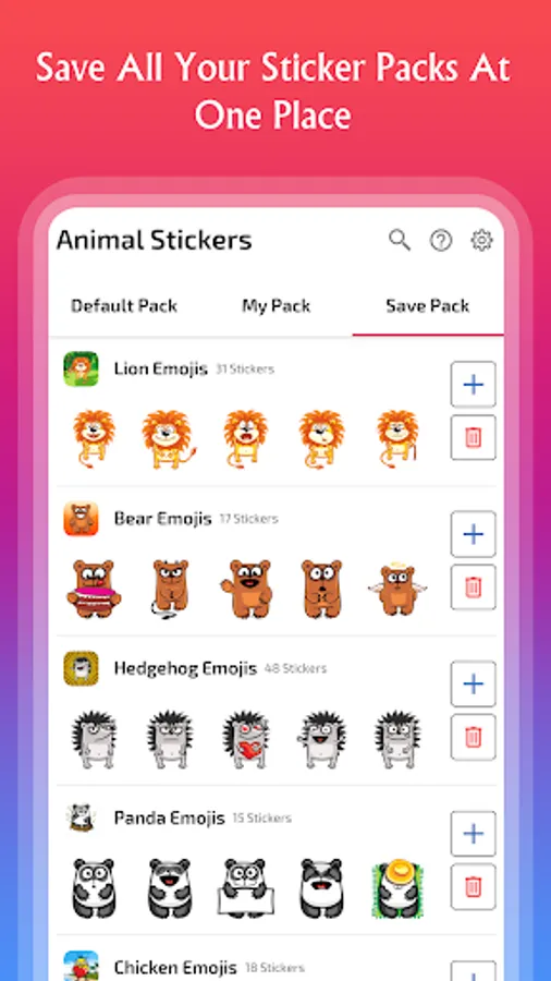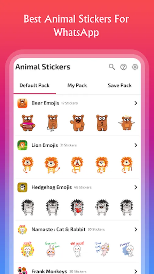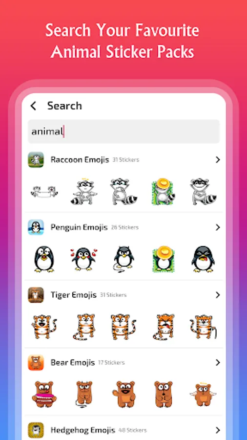 Animal stickers app includes sticker packs of animals like cat, panda, bear, dog, penguin, tiger, wolf, giraffe, lion, raccoon, hedgehog, rabbit, unicorn, rat, skunk and many more.