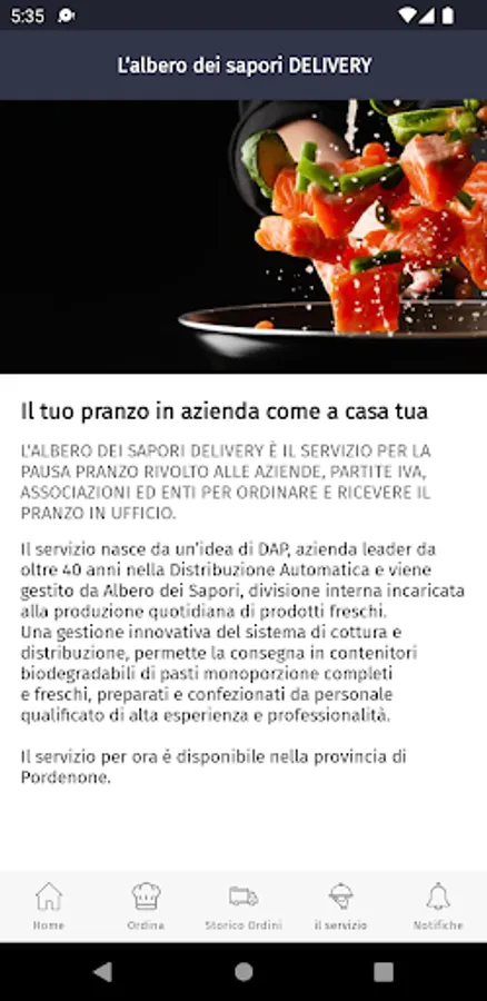 The service was born from an idea of DAP, a leading company for over 40 years in Automatic Distribution and is managed by Albero dei Sapori, an internal division responsible for the daily production of fresh products. An innovative management of the cooking and distribution system allows the delivery in biodegradable containers of complete and fresh single-portion meals, prepared and packaged by highly experienced and professional qualified personnel.