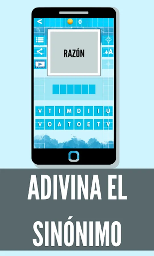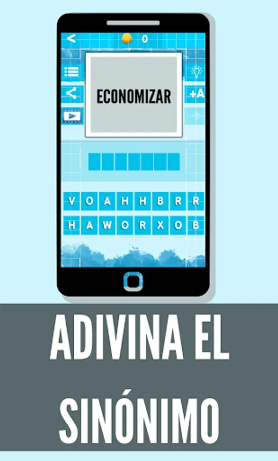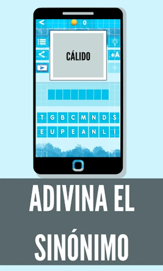 - An image with a word appears and below the screen there are some squares where the answer has to fit and some letters at the bottom. Select the letters from the lower part to complete the searched word and guess the correct synonym