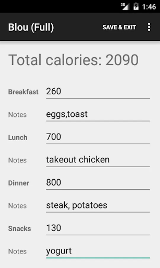 Simply enter calorie values into the box corresponding to your meal, add a description if you like, and keep track of your calories the easy way.