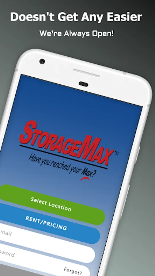 The StorageMax Self Storage App is the easiest and most secure way to rent a new unit from one of our locations. You can also see the pricing and unit availability in real time! Renting a new unit and paying your monthly bill are just a few of the tasks your app will perform easily, all from your smartphone. Let us help you make life simpler by using our powerful application designed specifically for Android. New customers can rent a unit from start to finish with our app in just two to three minutes. Its simple! Current customers use their unit number and their password/gate access code to login. If your password/gate access code is unknown, please call our office during business hours and our manager will be glad to give you that information.