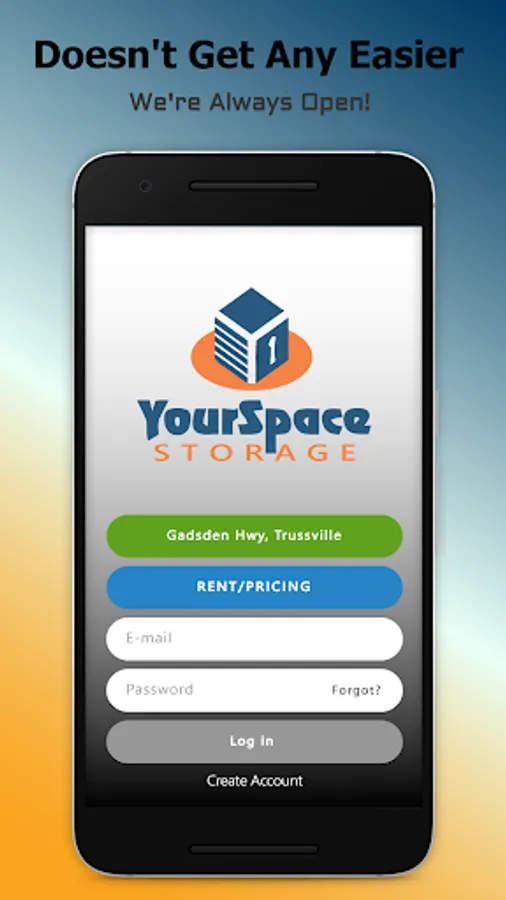 The YourSpace Storage app is the easiest and most secure way to Rent a new unit. See the pricing and unit availability in real time. Renting a new unit, paying your monthly bill, and the option to open the main entrance gate are just a few of the tasks your app will perform easily, all from your smartphone. Let us help you make life simpler by using our powerful application designed specifically for Android. New customers can rent a unit from start to finish with our app in just two to three minutes. It's simple! Current customers use their unit number and their gate access code to login.