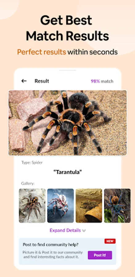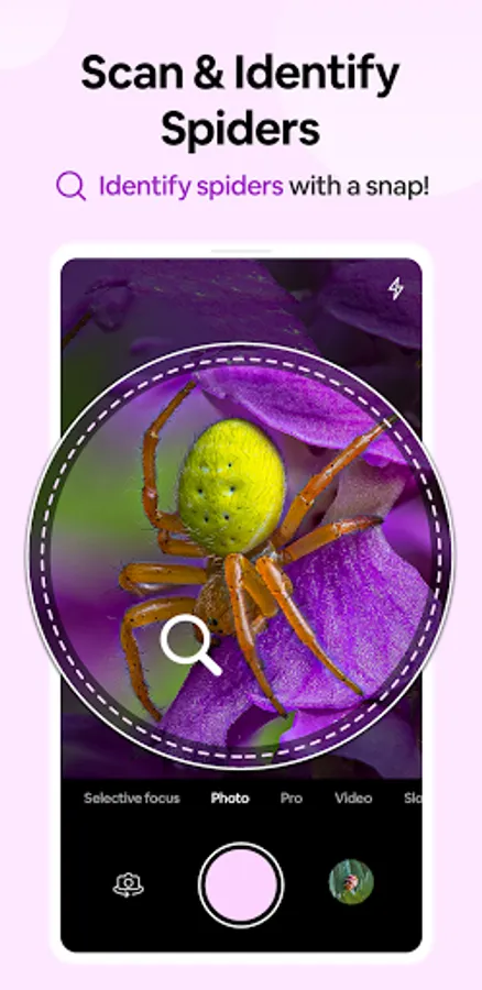 Photo Cam feature lets you snap pictures of bugs and spiders on the go. No need to browse through your gallery – capture and identify insects and spiders in real time with ease.