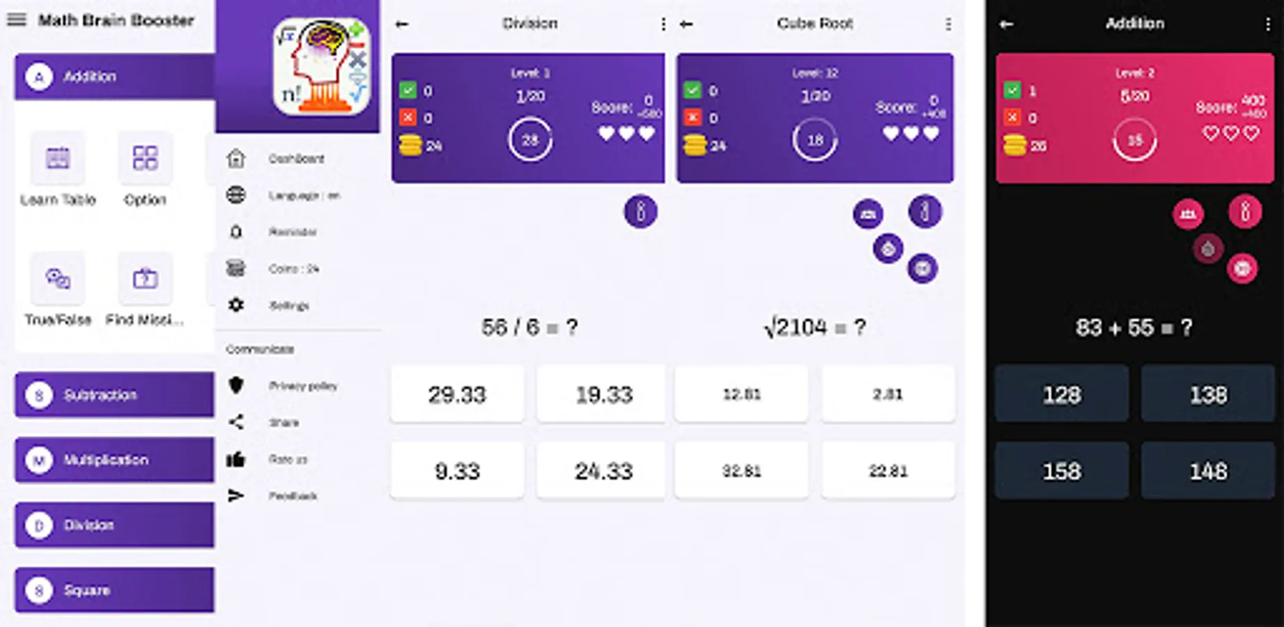 Learn Mathematics tips and tricks with Brain's Boosting Game with different options. You can learn Tables, Additions, Substractions, Multiplications, Division, Square root, Cube root, Factorial, Complicated Multiplications, Mixed Questions etc..