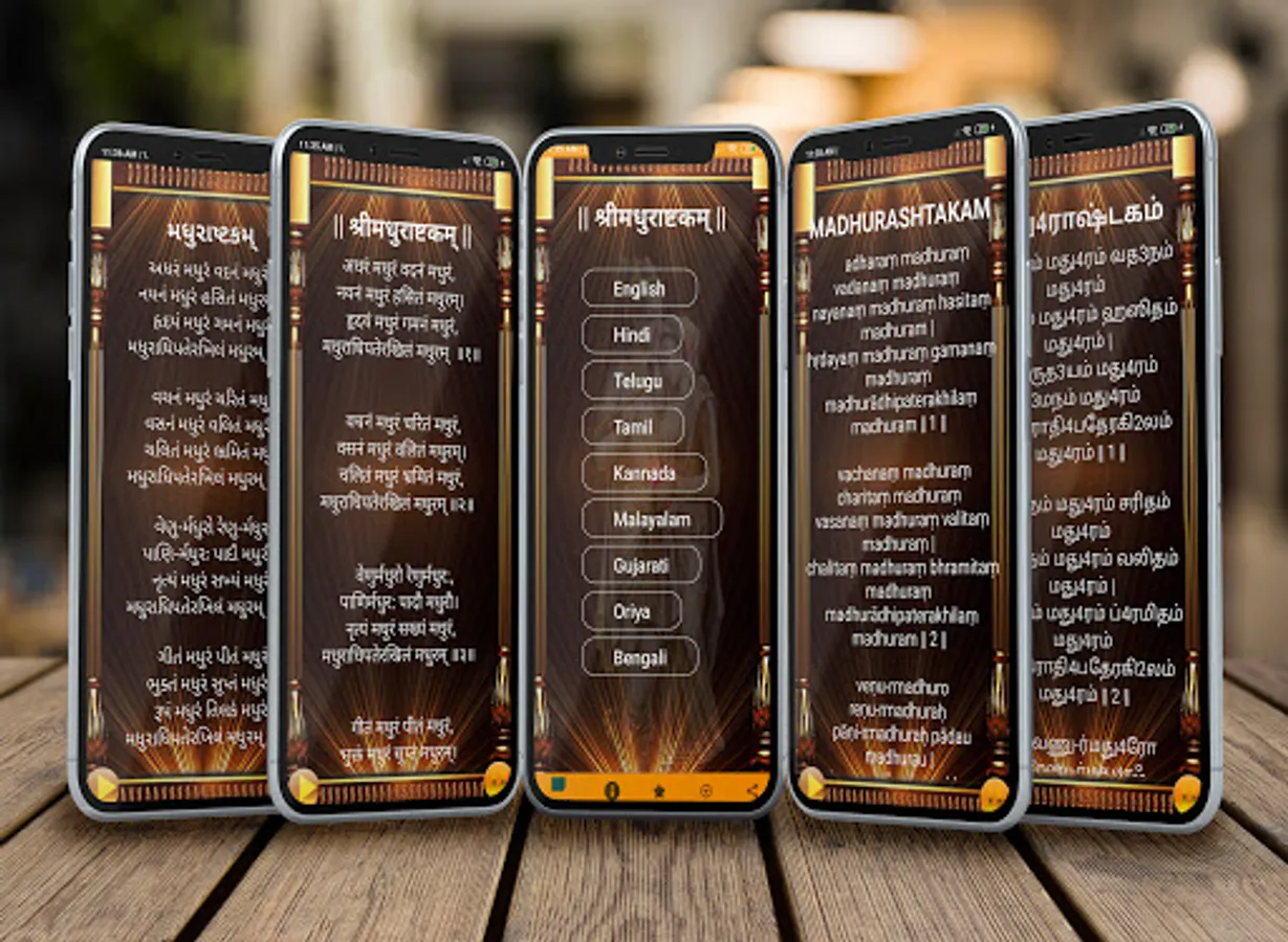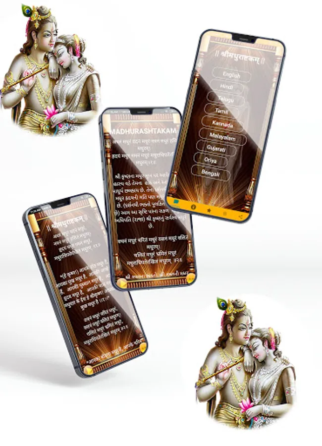 This App is now available in 9 different languages with listning features. Choose your own native language to read Shree Madhurastakam. Languages are: English, Hindi, Tamil, Telugu, Kannada, Malaylam, Oriya, Bengali and Gujarati.