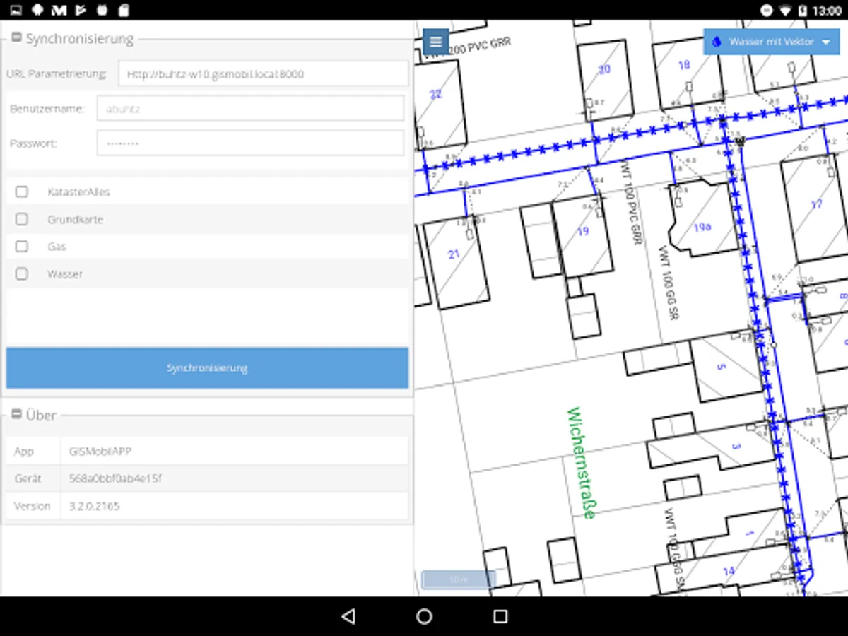 This app enables the map display of line documentation in offline and online mode. The data is provided by a GISMobil WEB map server. For offline mode, the mobile device receives the data via a synchronization process. The representation of the offline data can contain both raster data and vector data. Furthermore, WMS / WMTS sources can also be integrated in online operation.