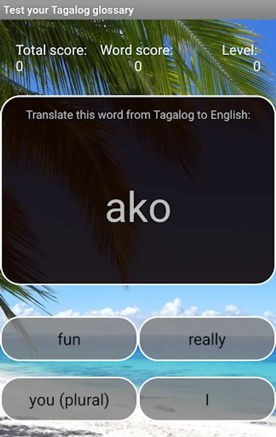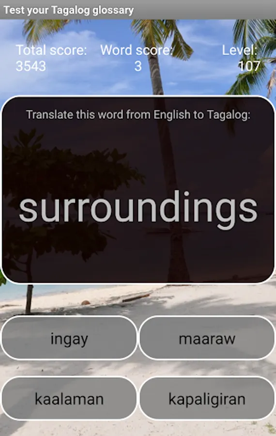 This is a simple app which will help you to test and increase your Tagalog vocabulary. The app shows you a word, and you must pick the correct translation.