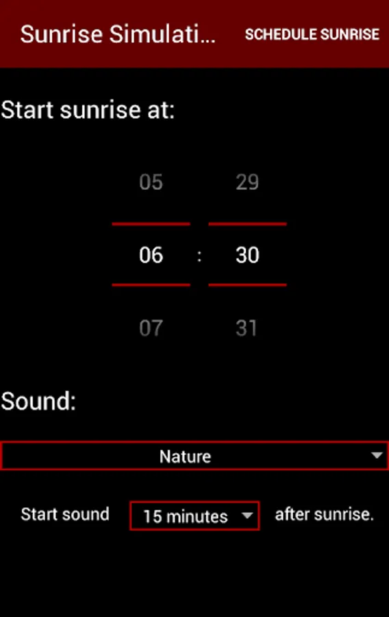 Many people think it's easier to get up from the bed in the morning if they are wakened by light instead of sound. This app works as a wake-up light: you can set a time, and at that time a simulated sunrise will start. For about 30 minutes the screen will slowly become brighter and brighter. Hopefully this will eventually wake you up. If it does not, after 40 minutes the screen will start to flash.