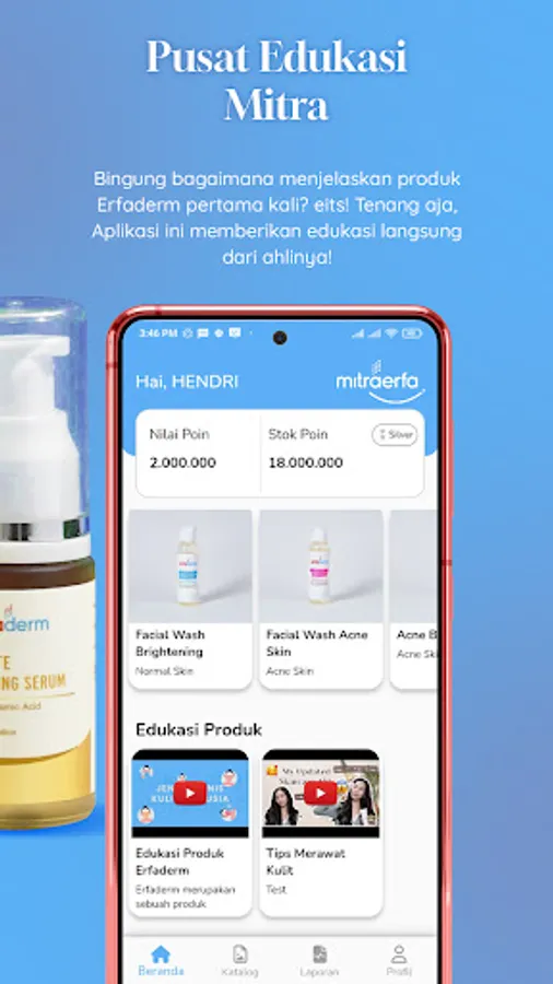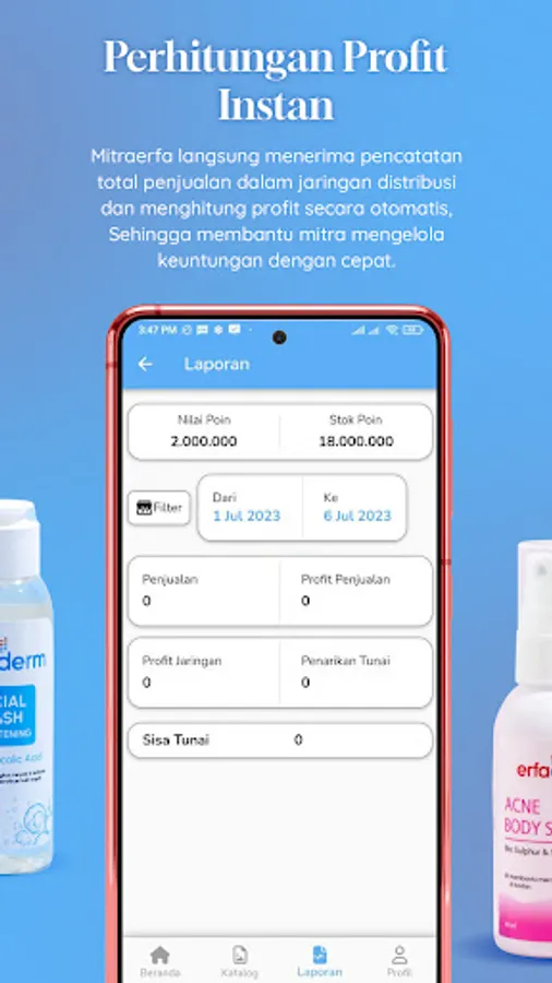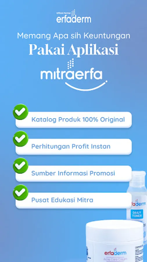 Mitraerfa is an innovative application specially designed for Erfaderm product business partners. With our commitment to provide the best quality, safety, authenticity and sophistication. Mitraerfa is here as the best solution for those of you who want to distribute Erfaderm products easily and efficiently.