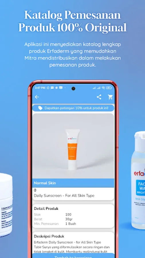 Erfaderm products are under the supervision of the Food and Drug Supervisory Agency (BPOM) and are Halal certified. This application has features that are carefully designed to meet your needs as an Erfaderm business partner. You can explore the full catalog of Erfaderm products, with detailed descriptions and attractive product images. You can also get the latest information about ongoing promotions, discounts and special offers, so you can provide attractive offers to your customers.