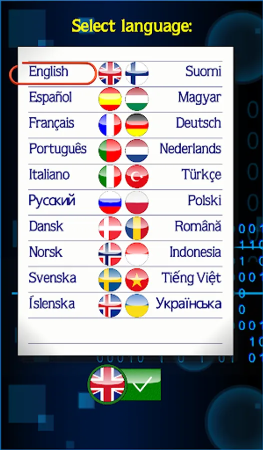 Twenty languages to choose from including English, Spanish, French, Portuguese, Italian, Russian, Danish, Norwegian, Swedish, Icelandic, Finnish, Hungarian, German, Dutch, Turkish, Polish, Romanian, Indonesian, Vietnamese and Ukrainian.