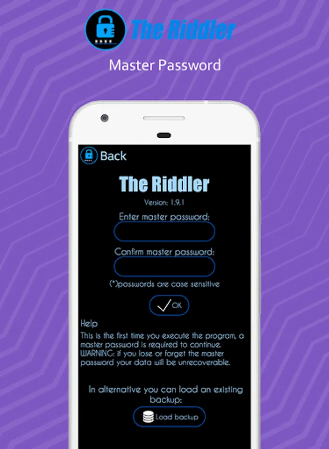 ❶ The first time you run the app, The Riddler will ask you for a master password, the only one you will have to remember, that will be used to acess to the Riddler's database.