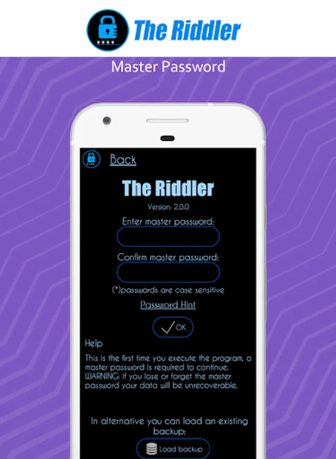 ❶ The first time you run the app, The Riddler will ask you for a master password, the only one you will have to remember, that will be used to acess to the Riddler's database.