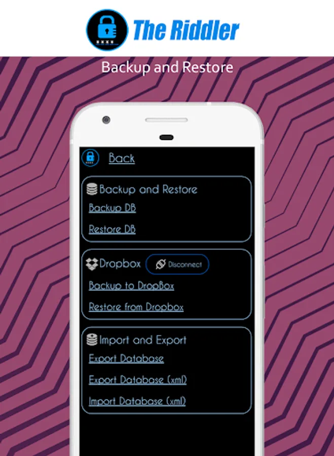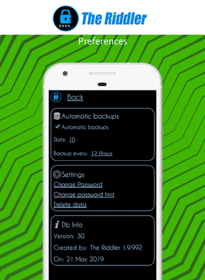 ❸ Whenever you need, all your data is a tap away from you, stored securely in your smartphone. Just log into The Riddler and browse your data. Enjoy the quick search , copy to clipboard, go to website function and many others.From the main screen you will be able to access to backup and restore options as well as the export function and more.