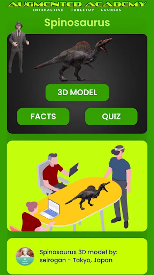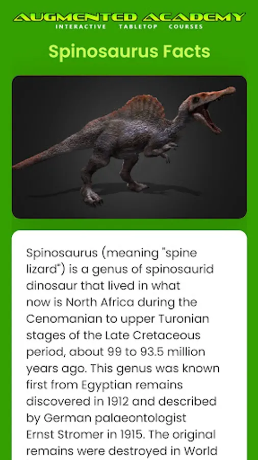 Learn about the Spinosaurus dinosaur using augmented reality 3D models. Study the Spinosaurus facts, experience the 3D Spinosaurus model, listen to the narration and then complete the quiz. Students will love to learn the fun way! Using augmented reality! Project the 3D Spinosaurus model on to your tabletop or desk and study it from all angles. Presented by the famous paleontologist, Jack Horner 3D model avatar.