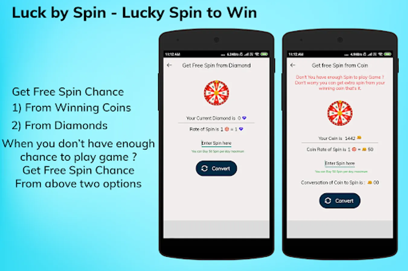 - When you don't have enough spin chance to play a game you can get a free chance from your collected diamonds in a game.