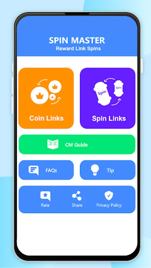 Spin Master use all gifted spin, coin and other reward links from available public domain such as official facebook, twitter pages, this means the token of all links generated, which is CM game owner. I don't claim rights on any content in my Spin Master. I always respect the rights and content of owner. Please note that this application is Not a means of circumventing game mechanics and abides fully by respective laws, terms and conditions.