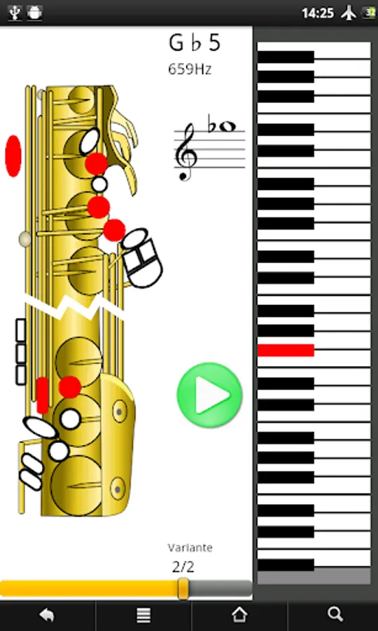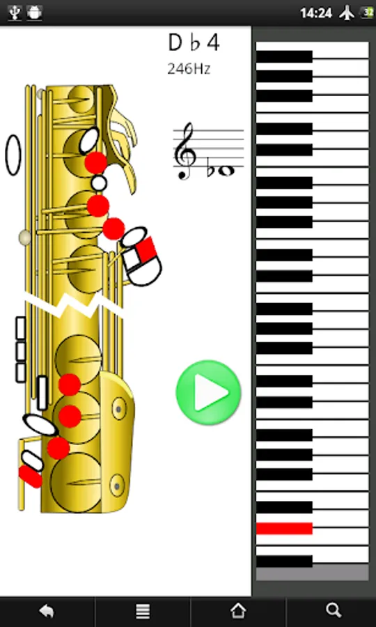 This application contains fingerings for play all tones from written B♭3 to B7. Simply press the piano key to hear the saxophone sound and see the fingering.