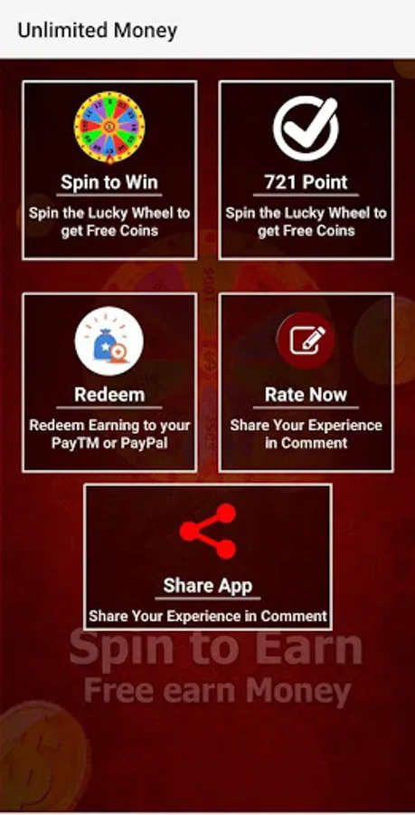 UNLIMITED MONEY- SPIN AND WIN is the best app free available on play store so download this app and let's enjoy it. Luck by spin & scratch is easy an application through with you can play at the same time earn some money. Now you can earn rewarded spin & scratch card and rewarded coins.