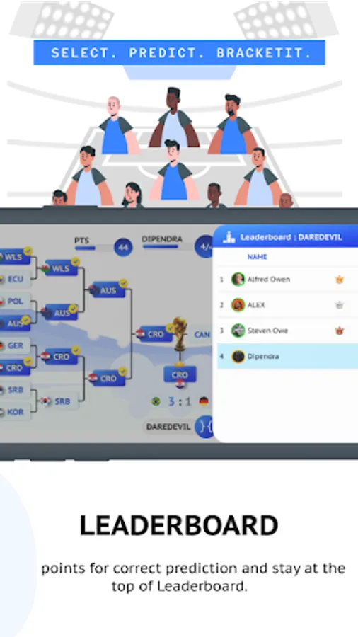 BracketIT is a mobile application designed to allow several users to come on board and share their excitement and passion for FIFA World Cup. The idea behind it is for you to make brackets, share them with your friends, and compete in them so that everyone may enjoy the sport. You can predict and compare the scores through leaderboard to make it exciting for all users.