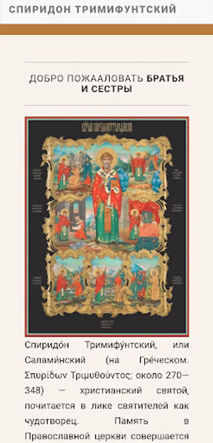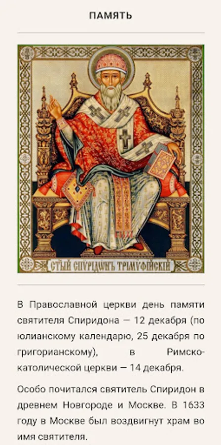 Spyridon Trimifuntsky, or Salamis (in Greek. Σπυρίδων Τριμυθούντος; lived around 270-348) is a Christian saint, revered in the face of saints as a miracle worker.