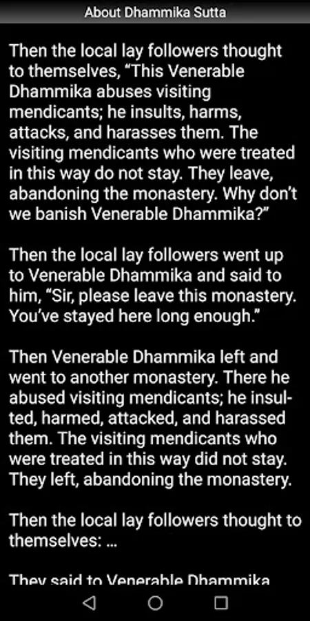 The monk Dhammika annoys both the monks and the layfolk so badly that they banish him. He comes to the Buddha, who consoles him and raises his spirits with a story, while at the same time showing him the error of his ways.