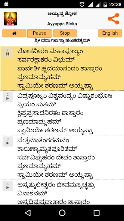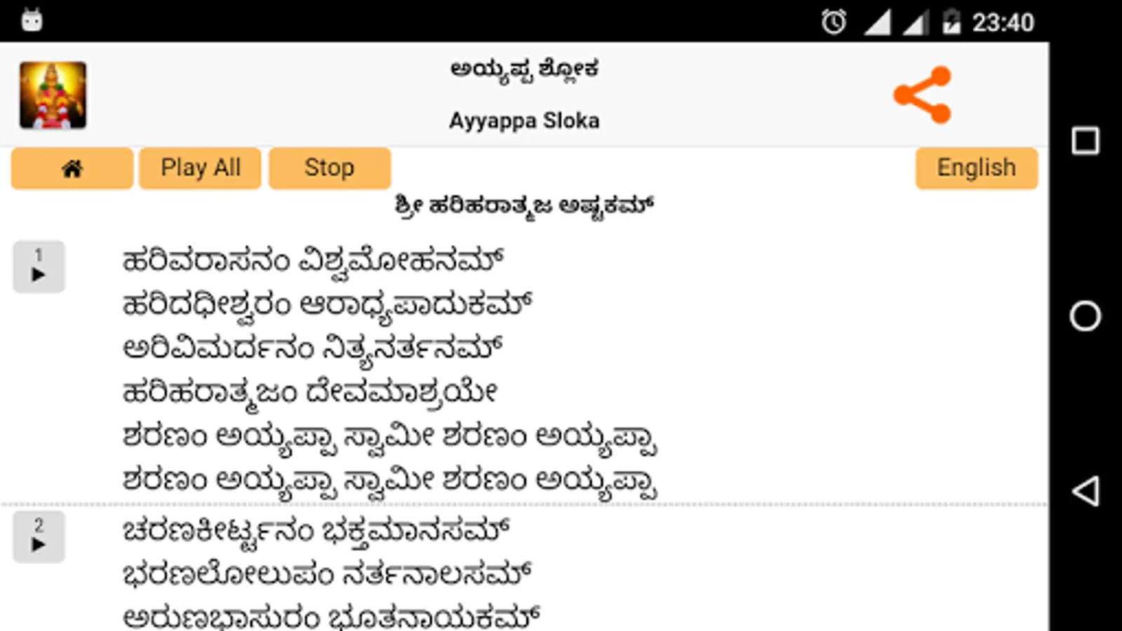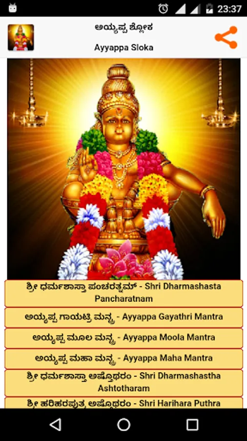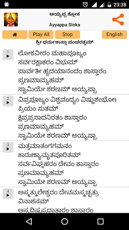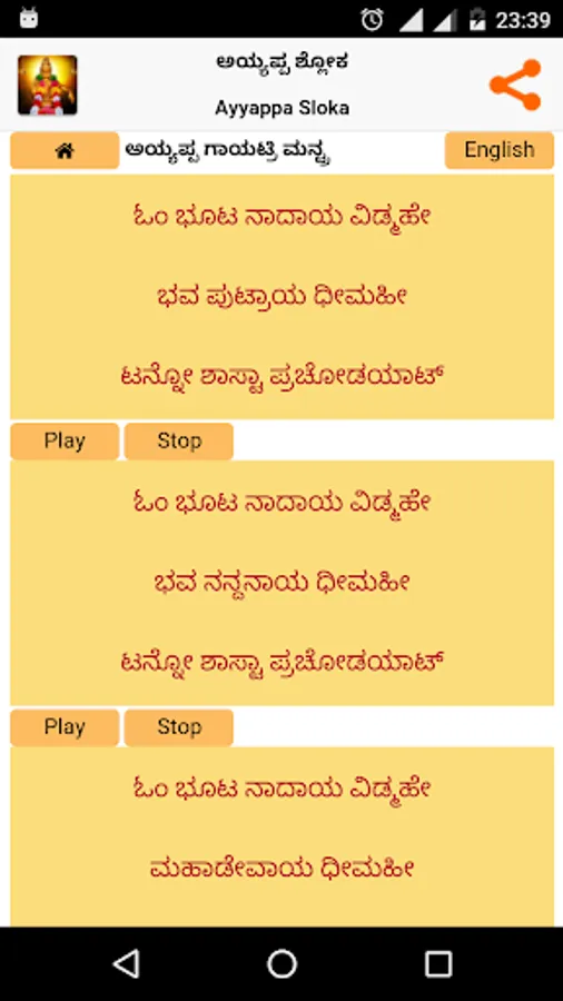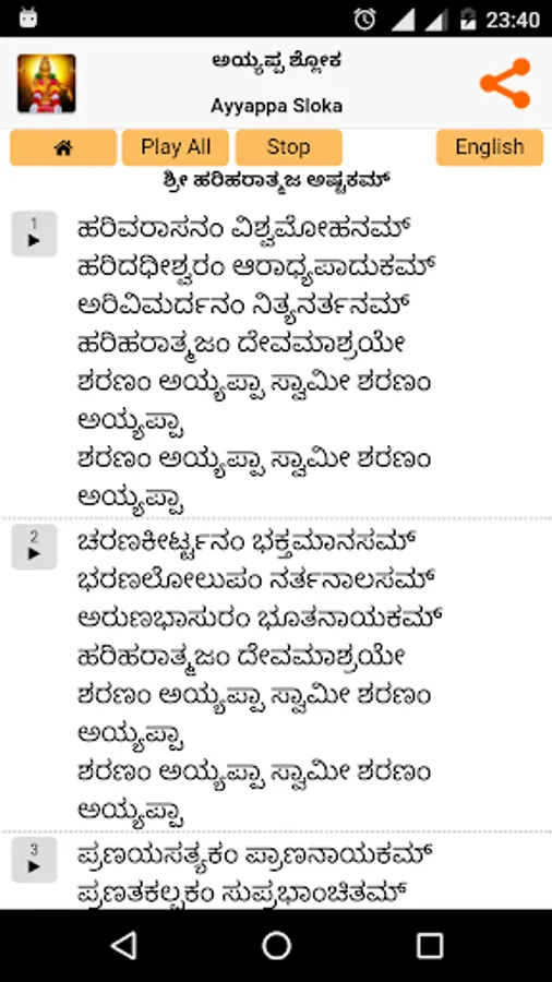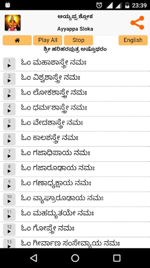 This application is in devotion towards Lord Ayyappa or Shri Dharmashasta. It has the below slokas and manthras in Kannada and English with audio. The audio helps to learn the mantra pronunciation.