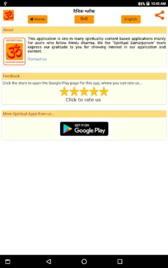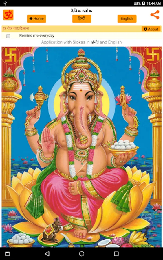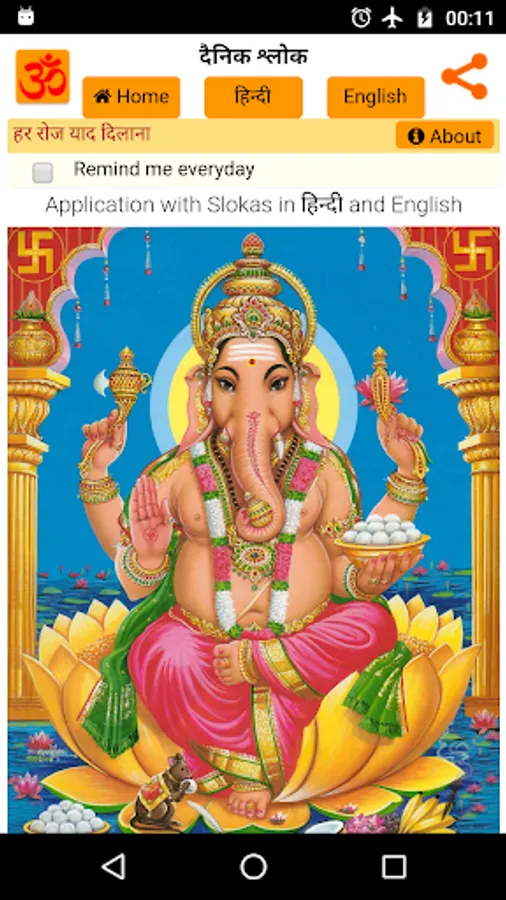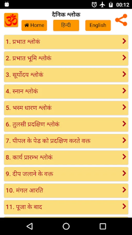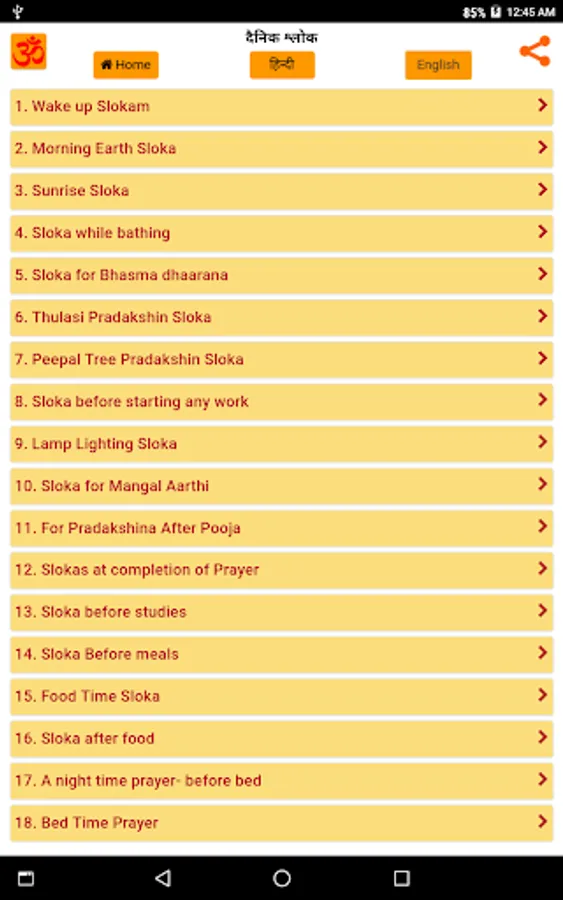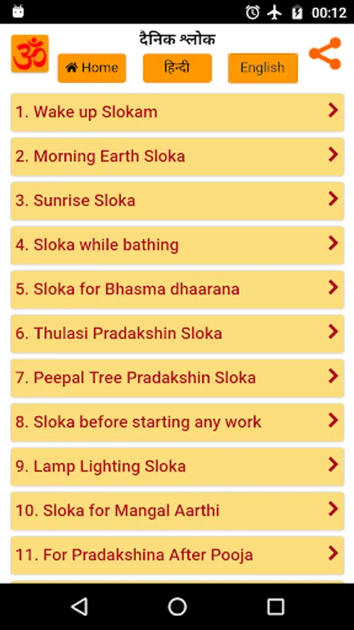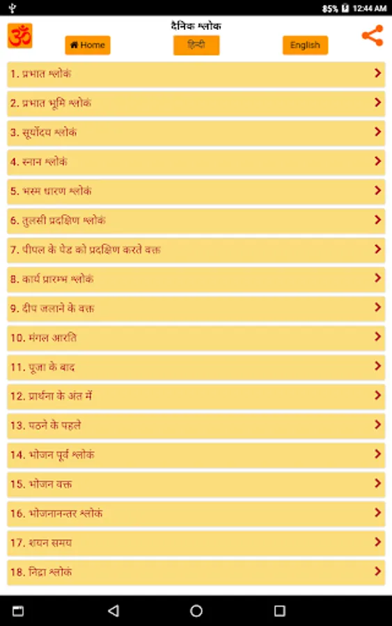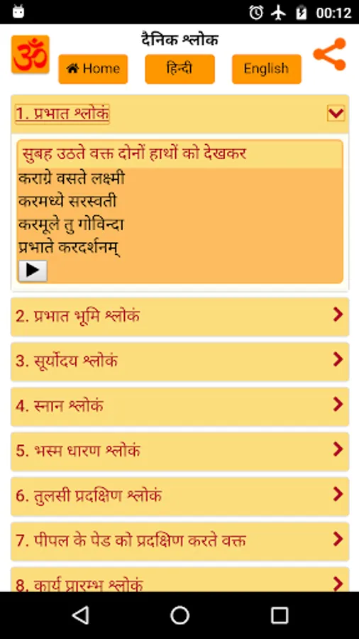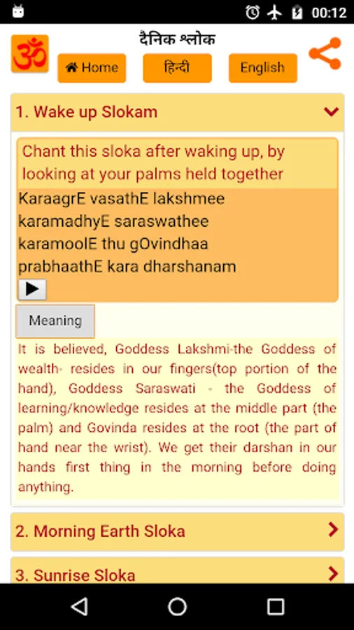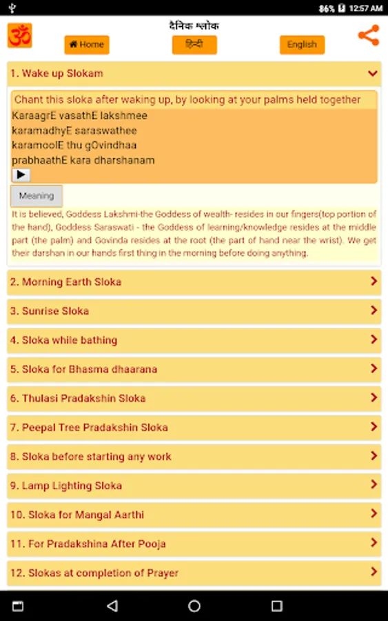 This App ( दैनिक श्लोक) has a list of Sloka / Shloka with Audio which can be chanted during/before/after various daily activities. The Daily Sloka / Shloka are given both in Hindi and English for convenience in reading. We have provided the meaning of many of the Sloka / Shloka in English. The objective of this application is to help the faithful user to know when what sloka is chanted and the English meaning in most cases. This application is one in many spirituality content based applications mainly for users who follow Hindu dharma.
