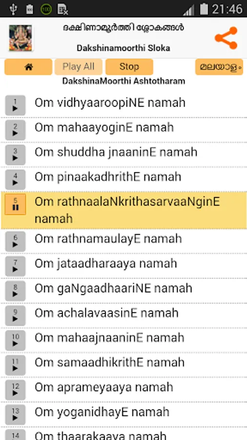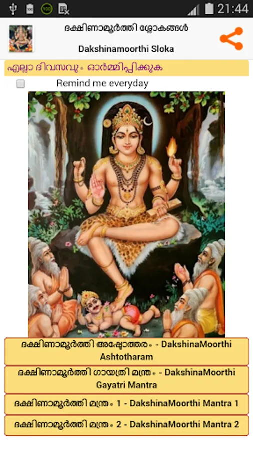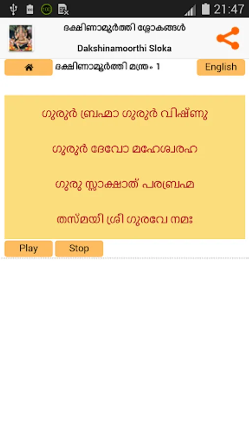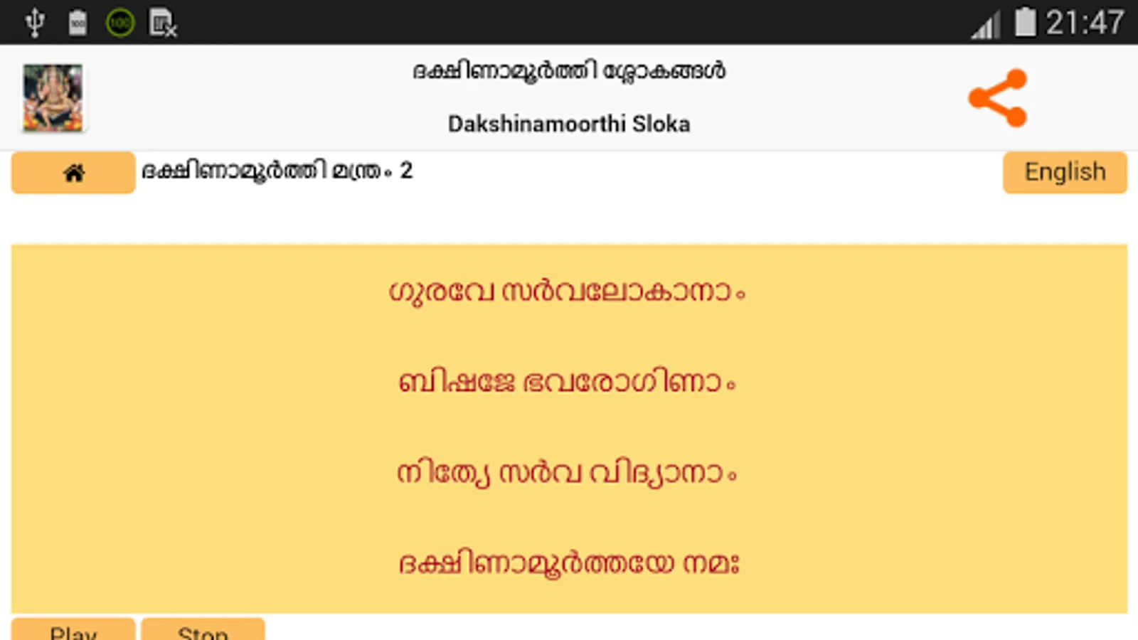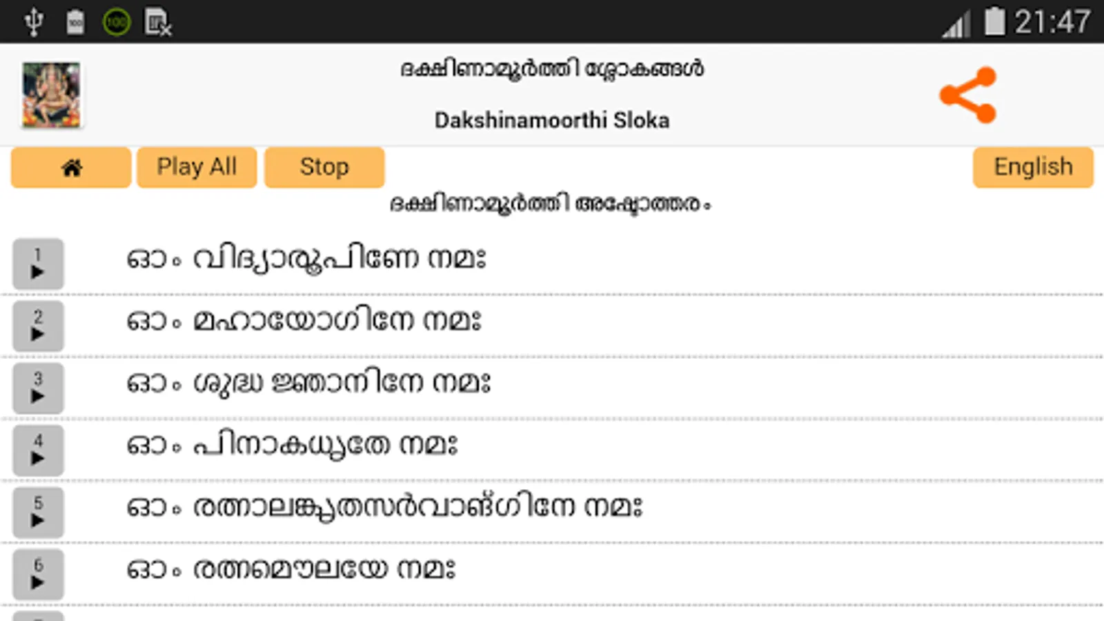 This application is in devotion towards Lord Dakshinamurthi. It has the below slokas and manthras in Malayalam and English with audio. The audio helps to learn the mantra pronunciation.