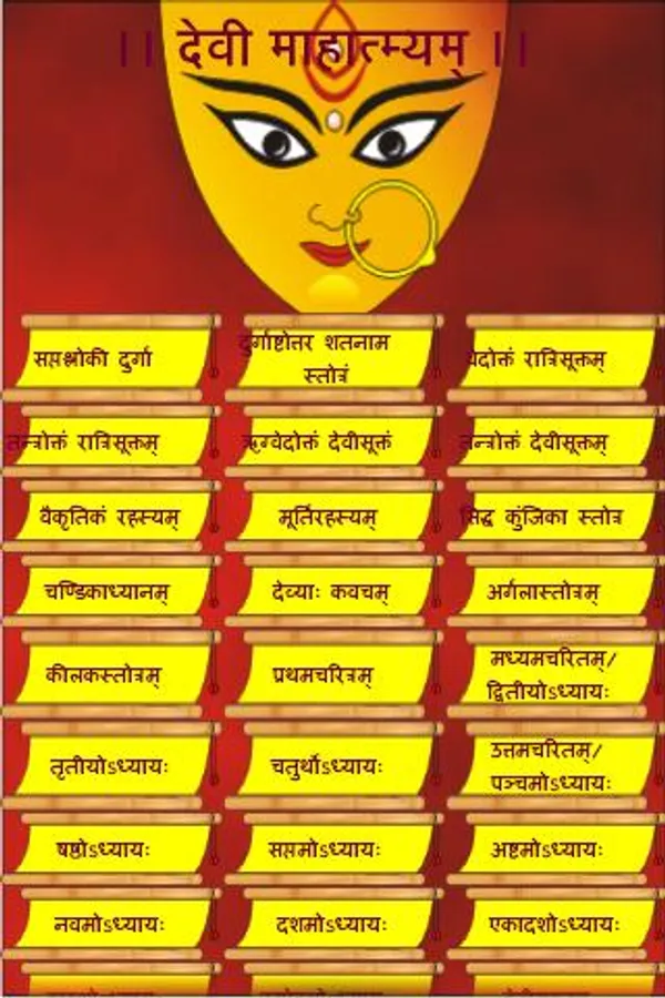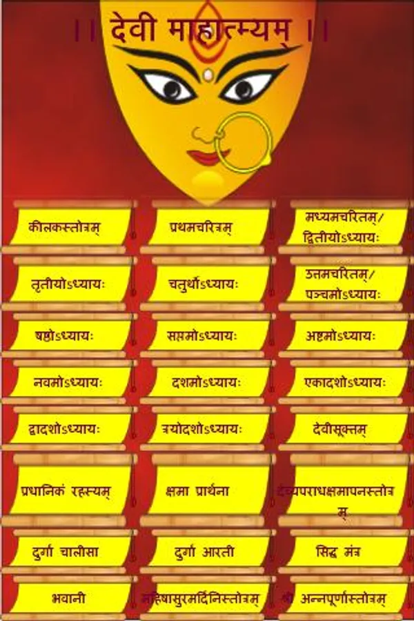 दुर्गा चालीसा, दुर्गा आरती, सिद्ध मंत्र, अन्नपूर्णास्तोत्रम्./, अर्गलास्तोत्रम्, अष्टमोऽध्यायः, चण्डिकाध्यानम्, देवीसूक्त्तम्, श्री देव्याः कवचम्दे, व्यपराधक्षमापन स्तोत्रम्, श्री भवानी सहस्त्र नामावलिः, दुर्गाष्टोत्तर शतनाम स्तोत्रं, कीलक स्तोत्रम्, क्षमा प्रार्थना, मध्यमचरितम्, महिषासुरमर्दिनि स्तोत्रम्, मूर्तिरहस्यम्, प्रधानिकं रहस्यम्, ऋग्वेदोक्तं देवीसूक्तं, सप्तश्लोकी दुर्गा, सिद्ध कुंजिका स्तोत्र, तन्त्रोक्तं देवीसूक्तम्,,तन्त्रोक्तं रात्रिसूक्तम्, उत्तमचरितम्, वैकृतिकं रहस्यम्, वेदोक्तं रात्रिसूक्तम्
