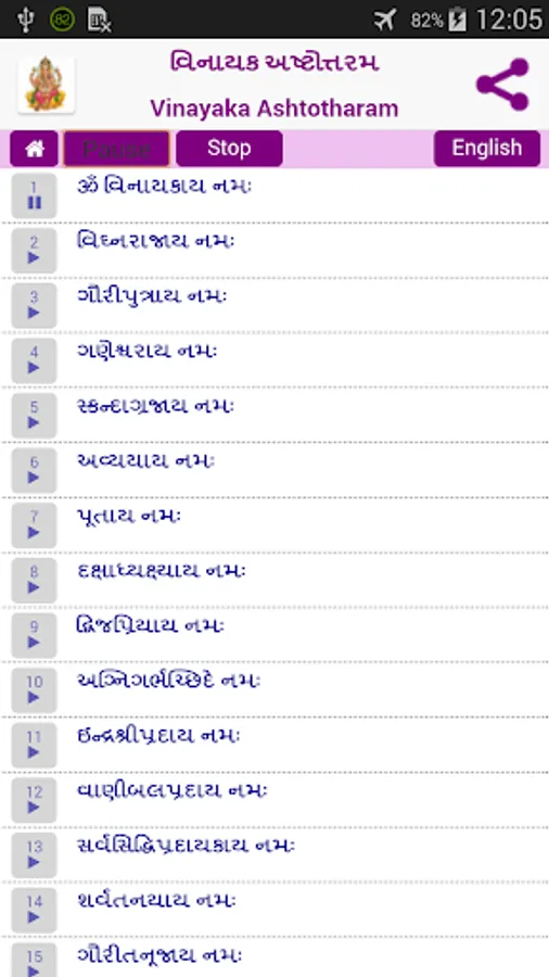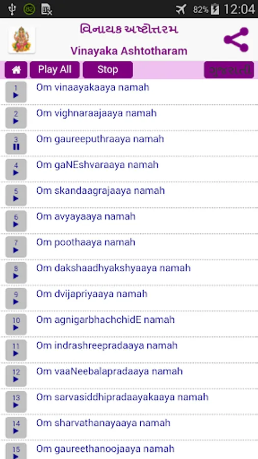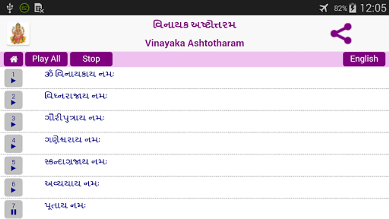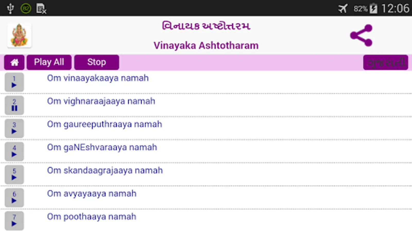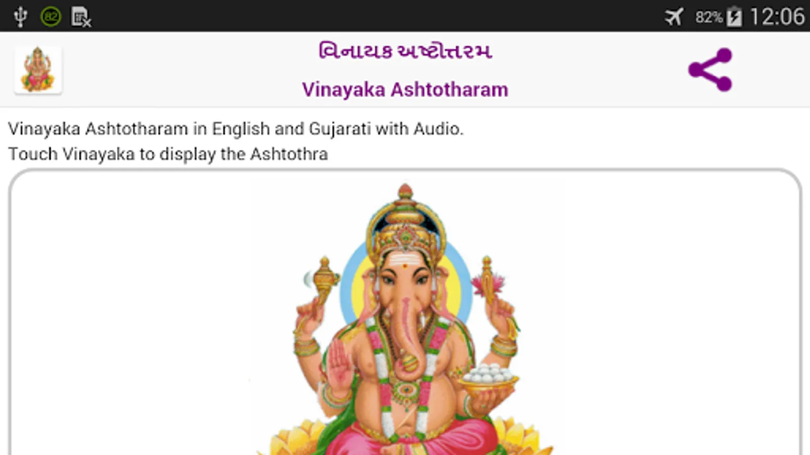 This application is in devotion to Lord Ganesha. This application has the Vinayaka Ashtotharam in Gujarati and English with Audio. Ashtotharam or Ashtotharasathanamavali are generally 100 or more names venerating the deity, in this application it is Vinayaka. Ashtotharams are chanted while offering flowers to the deity during daily pooja. One can chant Vinayaka ashtotharam during pooja everyday.