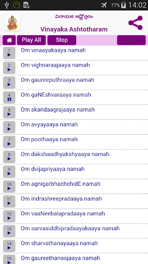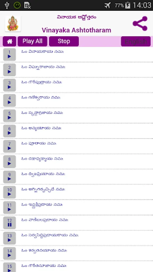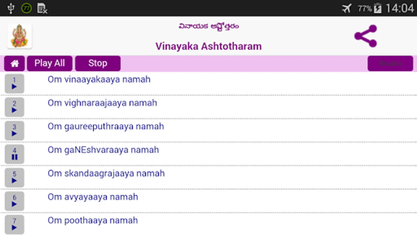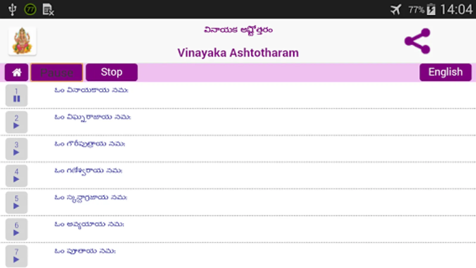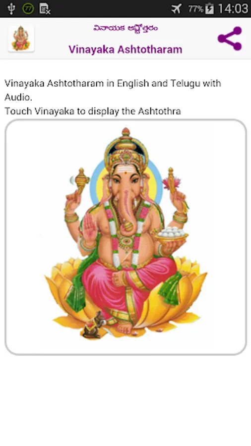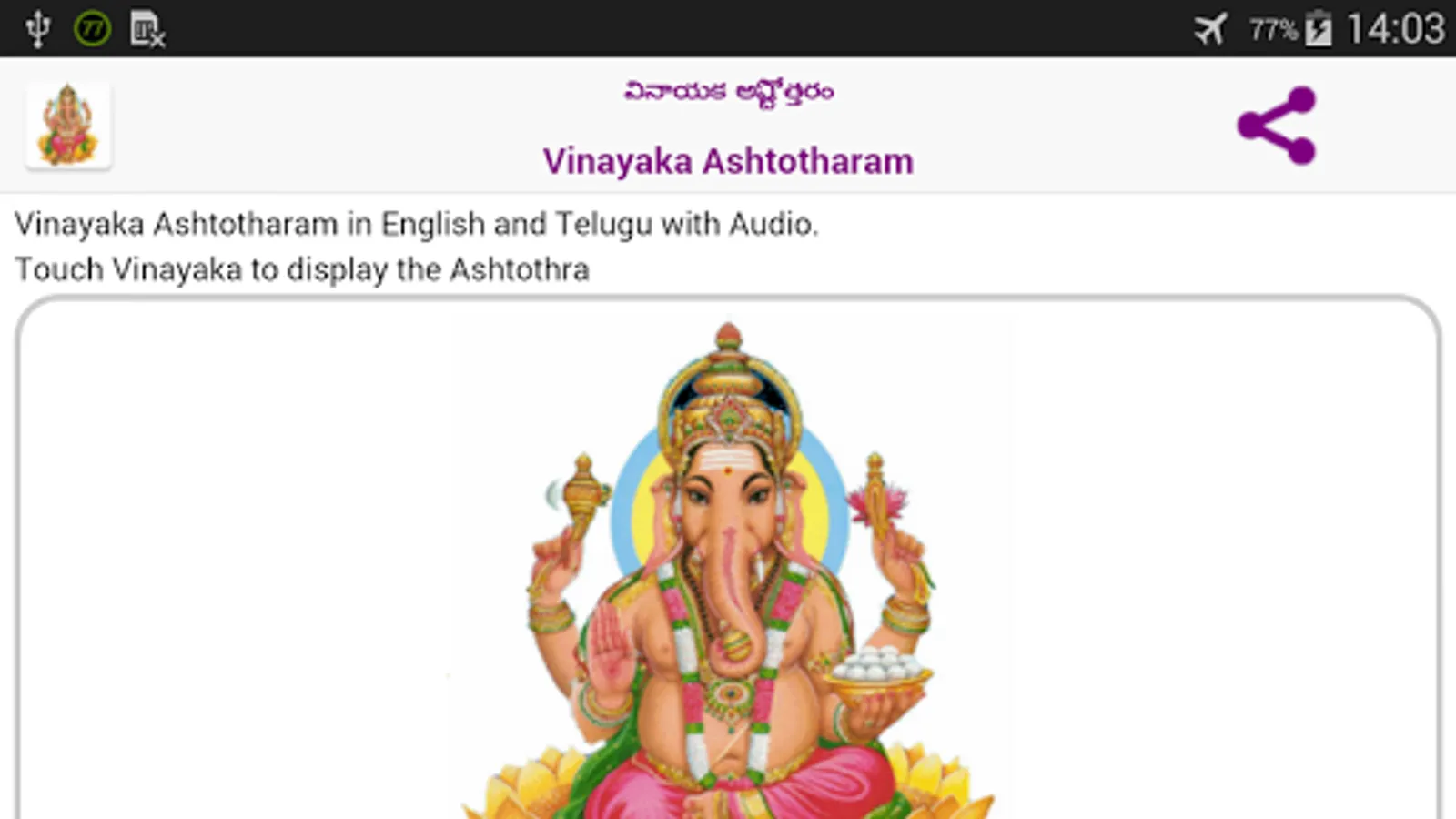 This application is in devotion to Lord Ganesha. This application has the Vinayaka Ashtotharam in Telugu and English with Audio. Ashtotharam or Ashtotharasathanamavali are generally 100 or more names venerating the deity, in this application it is Vinayaka. Ashtotharams are chanted while offering flowers to the deity during daily pooja. One can chant Vinayaka ashtotharam during pooja everyday.