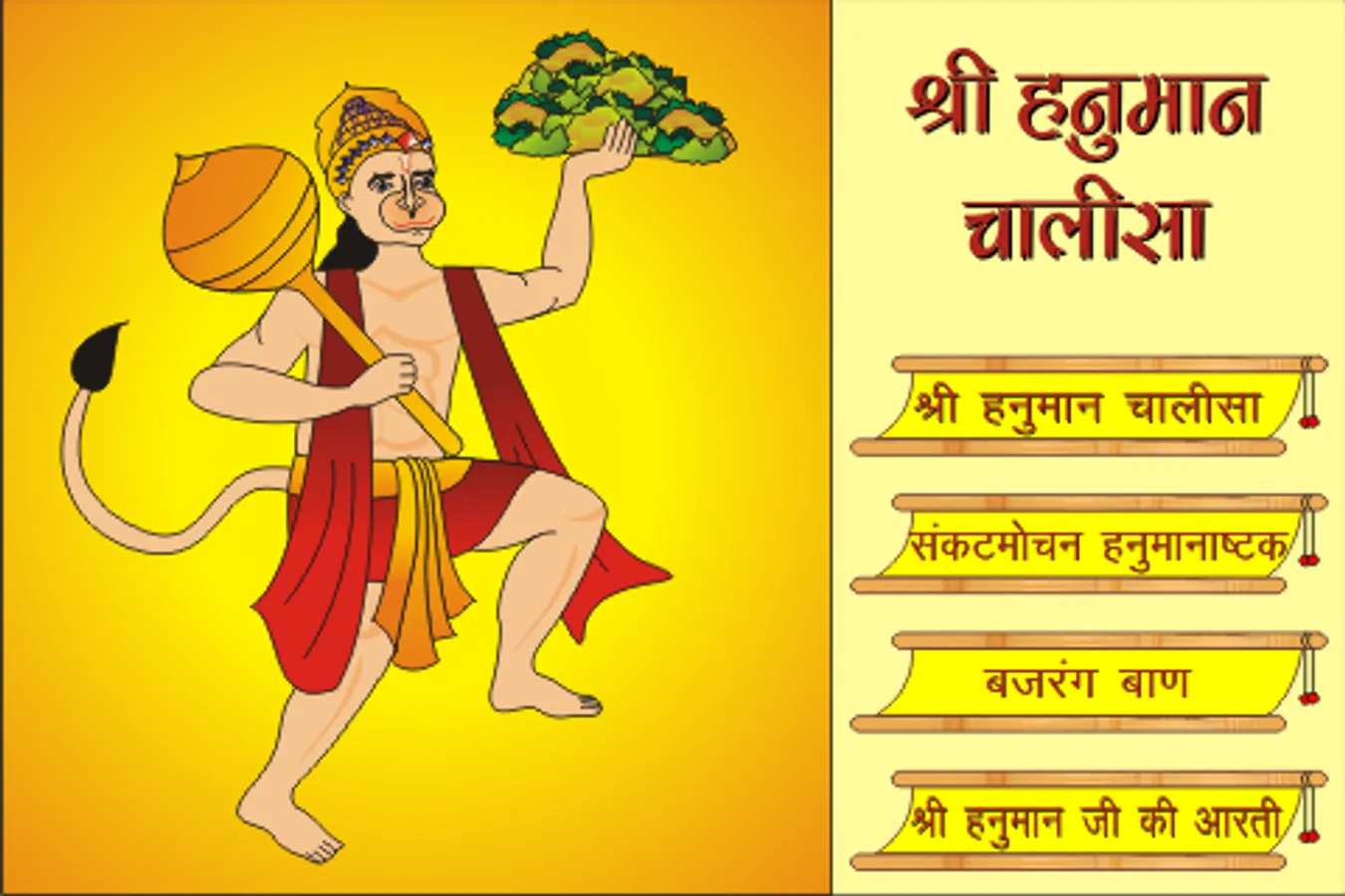 The app contains Hanuman Chalisa, Ashtaka, Bajrang Baan and Aarti.
