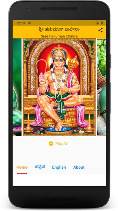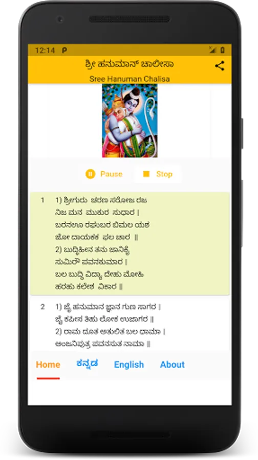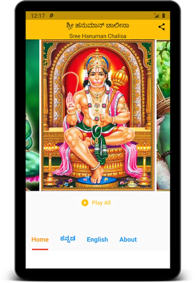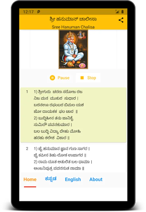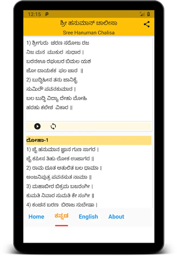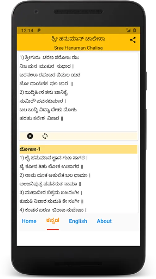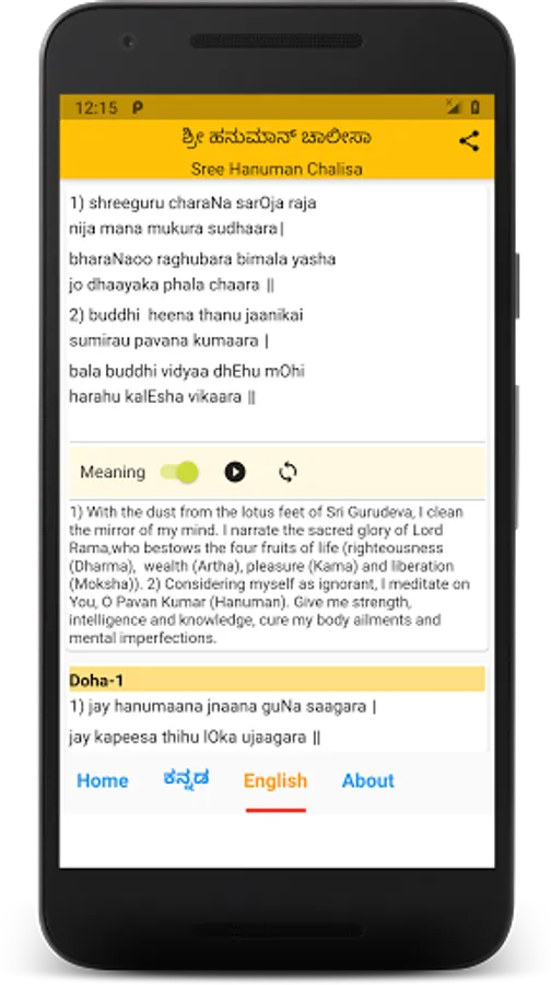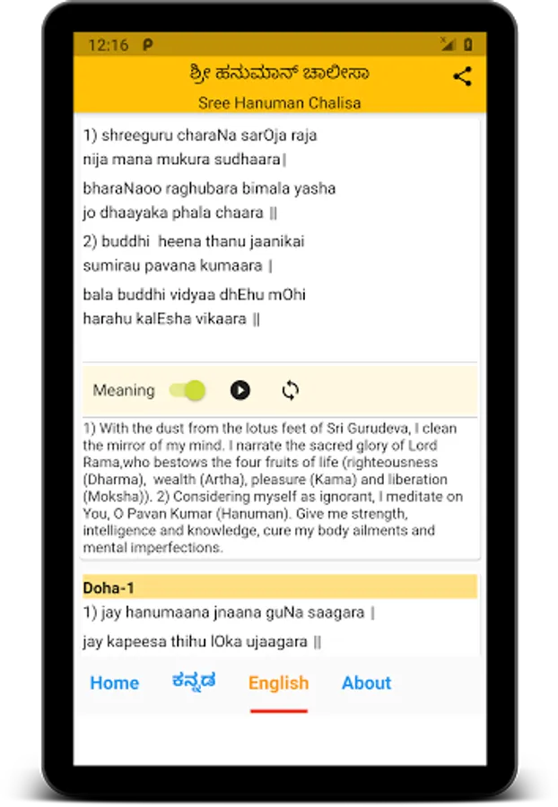 Hanuman Chalisa was composed by legendary poet Tulsidas who was also an ardent devotee of Lord Rama. It has 40 poetic verses, hence the name ‘Chalisa’, which means forty in Hindi. Anybody can recite the 40 verses, irrespective of the age and after a few recitals it automatically registers itself in the memory. This app helps one to learn Hanuman Chalisa with Audio and text in Kannada and English. There are options to play all the Dohas one after the other, repeat one doha as many times as needed. For other languages there are separate Apps available in play store.