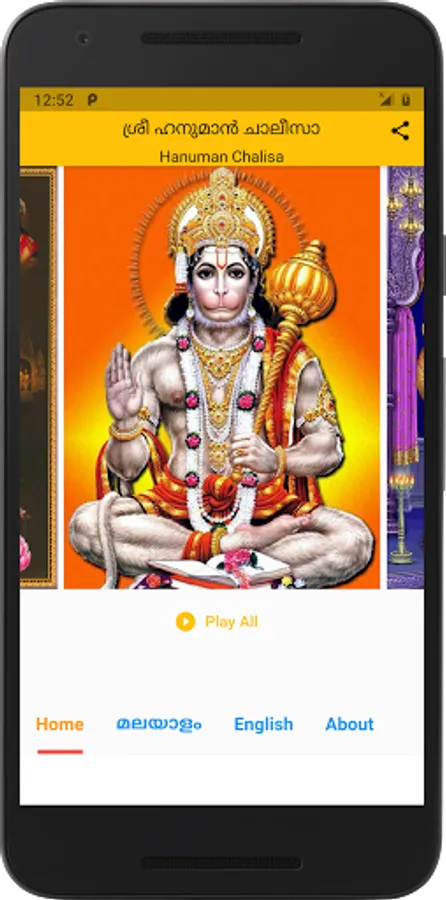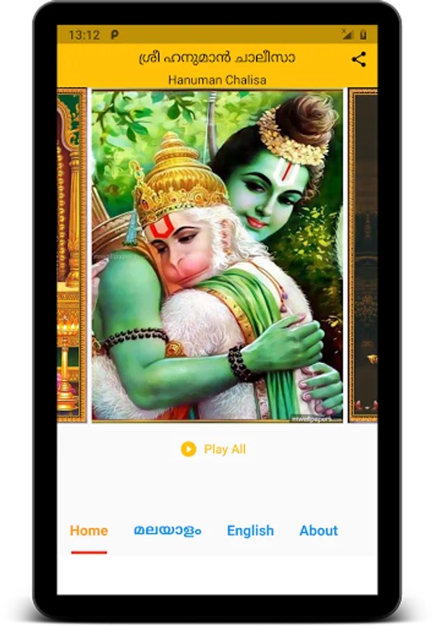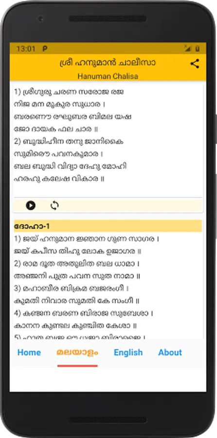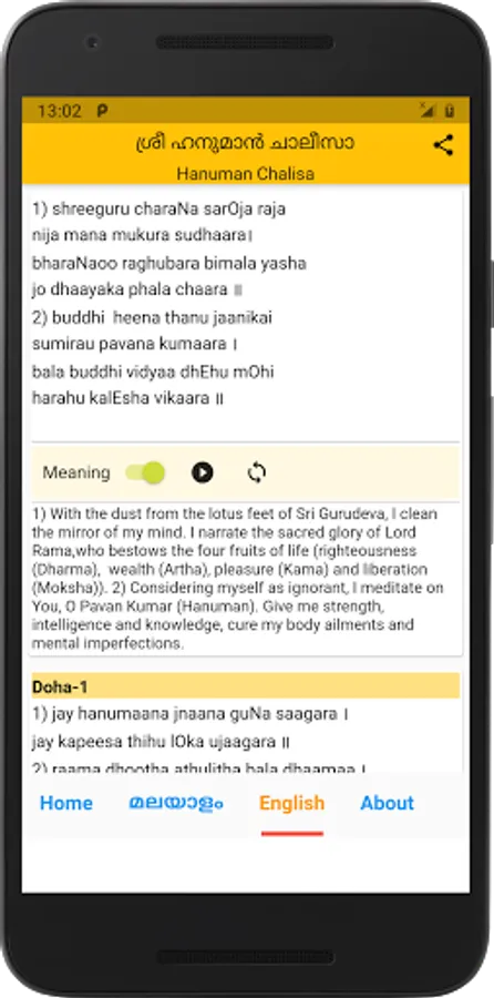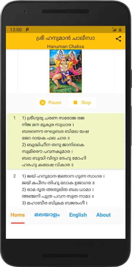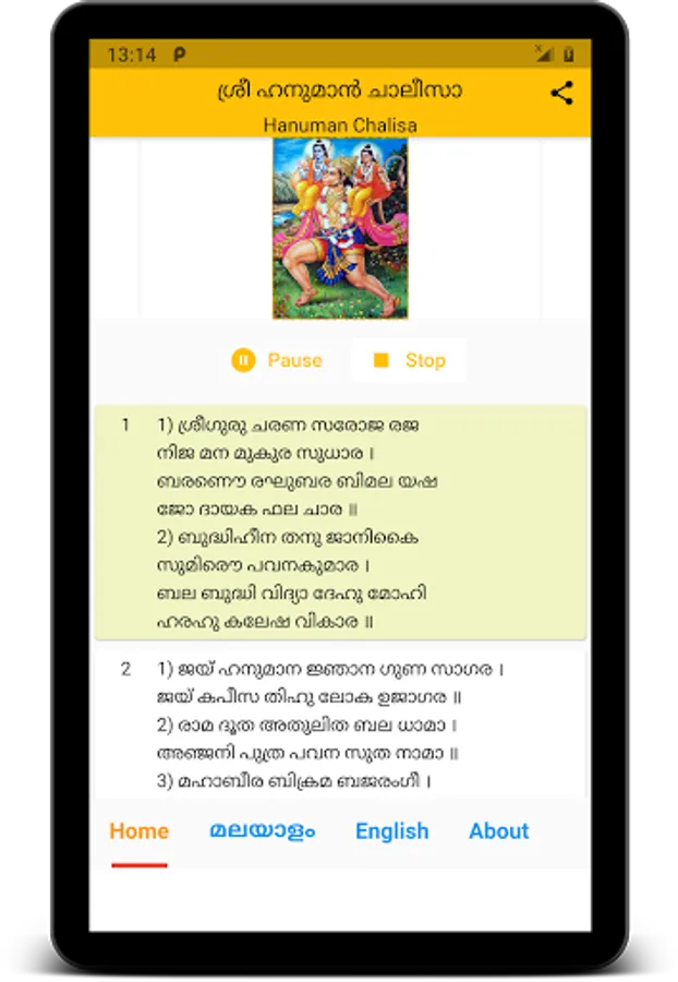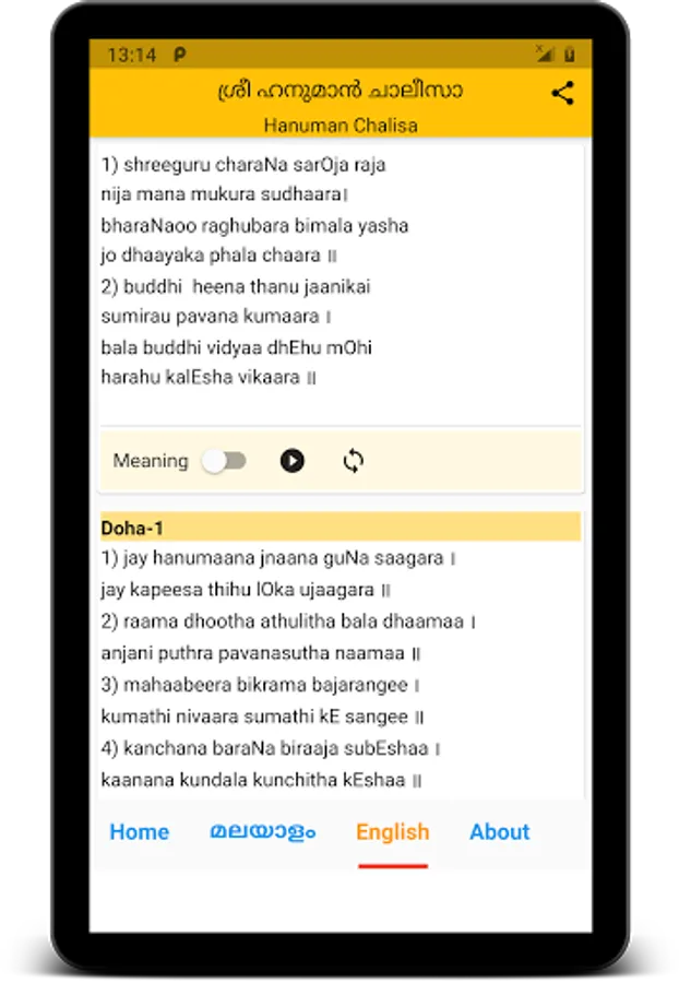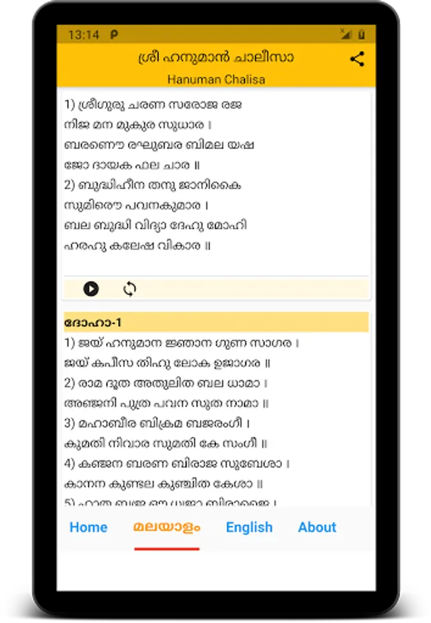 Hanuman Chalisa was composed by legendary poet Tulsidas who was also an ardent devotee of Lord Rama. It has 40 poetic verses, hence the name ‘Chalisa’, which means forty in Hindi. Anybody can recite the 40 verses, irrespective of the age and after a few recitals it automatically registers itself in the memory. This app helps one to learn Hanuman Chalisa with Audio and text in Malayalam and English. There are options to play all the Dohas one after the other, repeat one doha as many times as needed. For other languages there are separate Apps available in play store.