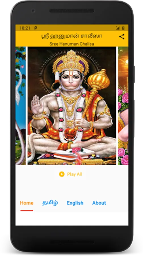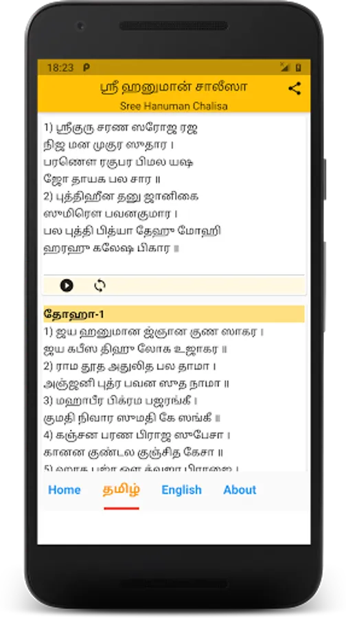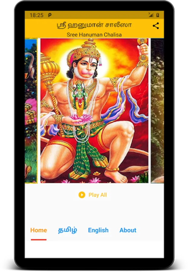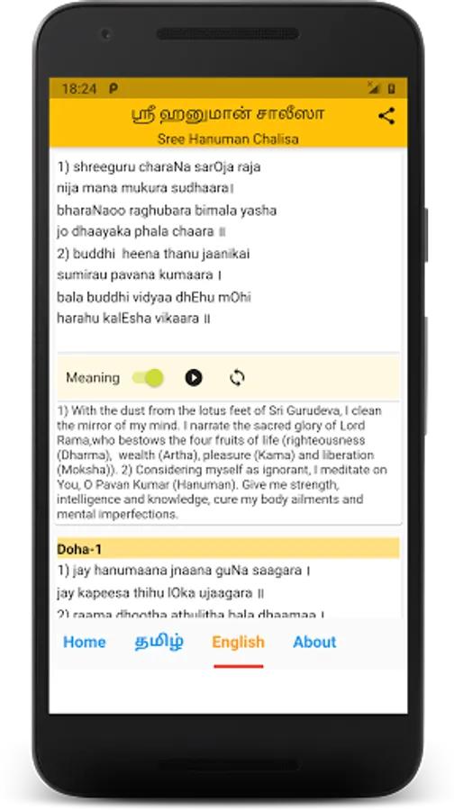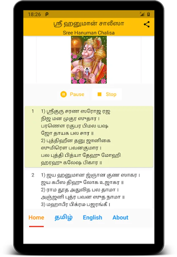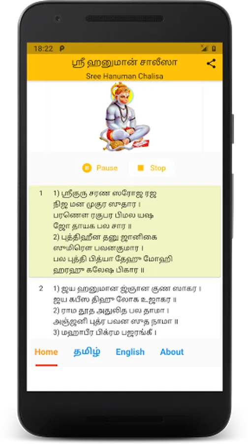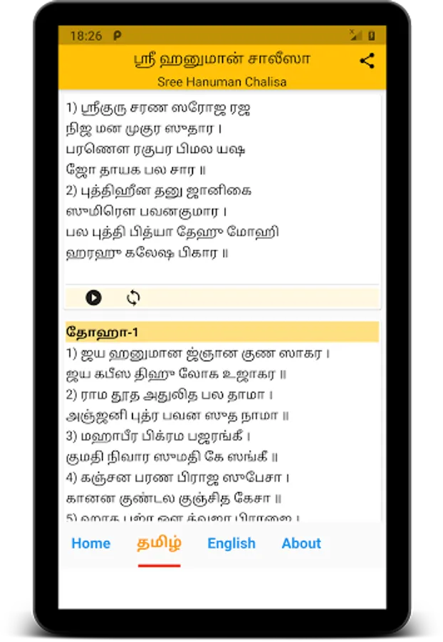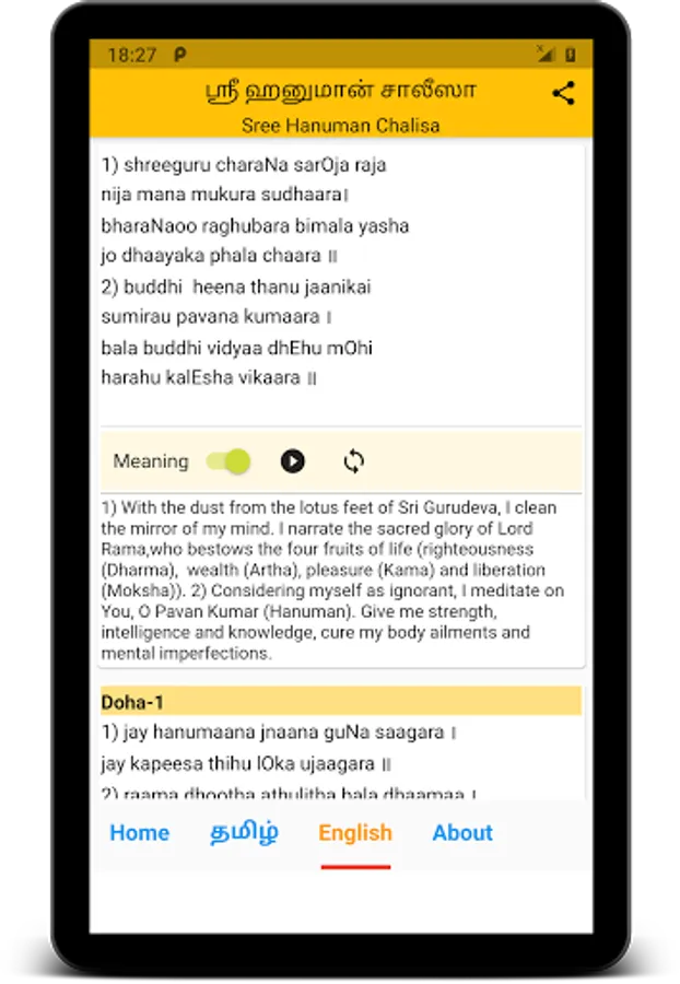 Hanuman Chalisa was composed by legendary poet Tulsidas who was also an ardent devotee of Lord Rama. It has 40 poetic verses, hence the name ‘Chalisa’, which means forty in Hindi. Anybody can recite the 40 verses, irrespective of the age and after a few recitals it automatically registers itself in the memory. This app helps one to learn Hanuman Chalisa with Audio and text in Thamizh and English. There are options to play all the Dohas one after the other, repeat one doha as many times as needed. For other languages there are separate Apps available in play store.