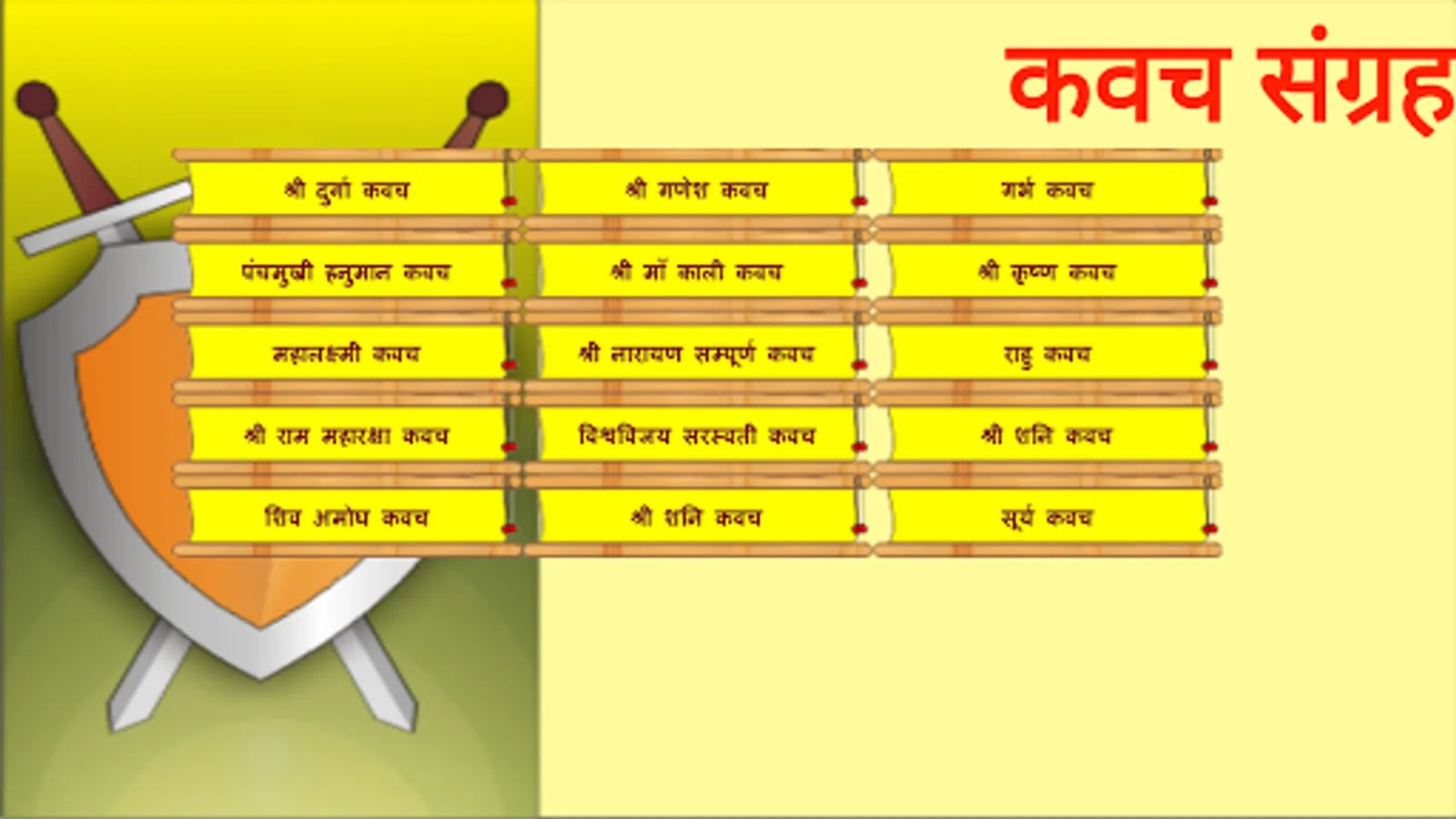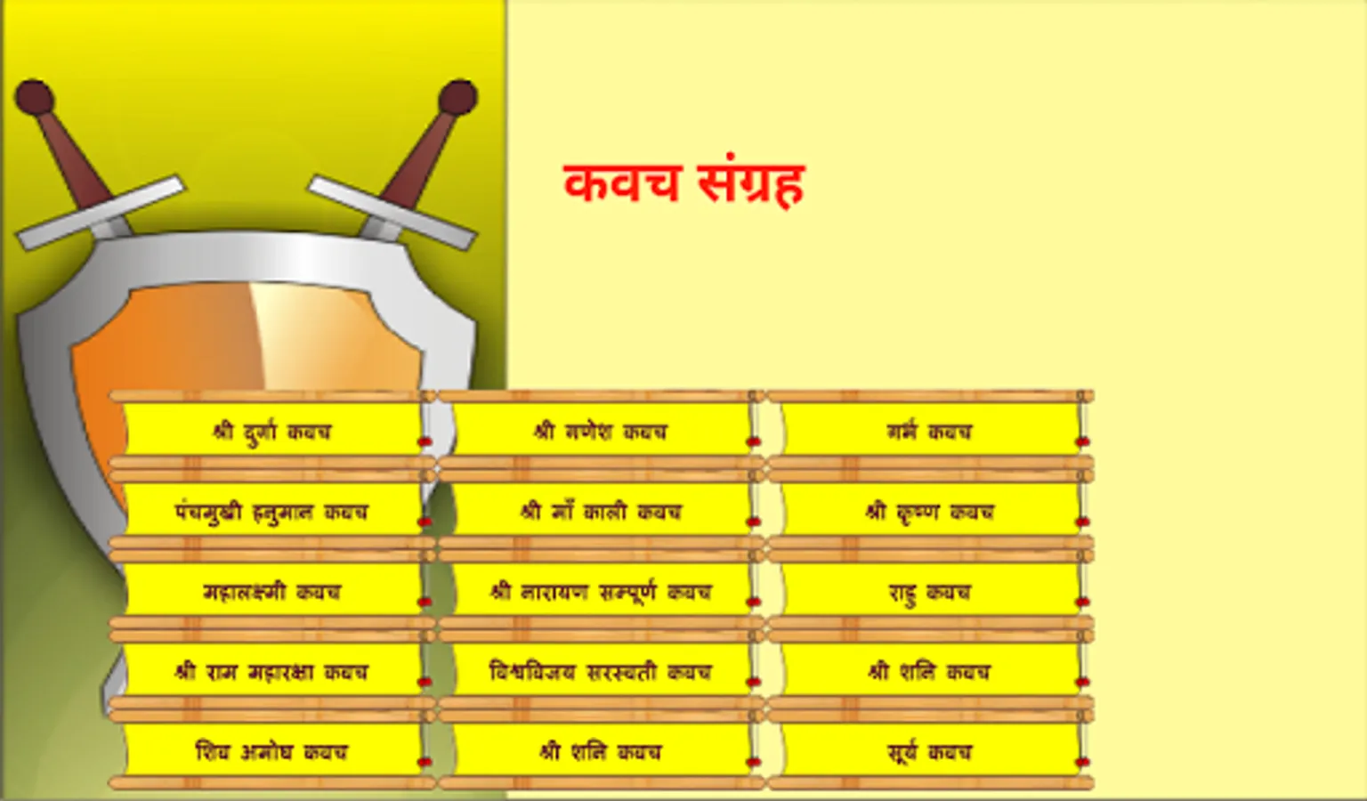 Durga, Maha Laxmi, Garbha, Shree Ganesh, Shree Krishna, Shiva Amogh, Panchamukhi Hanuman, Shree Narayan Sampurna, Shree Maa Kali, Surya, Shani, Shree Ram Maharaksha, Vishwavijay Saraswati, Rahu, Shree Shani Kawach