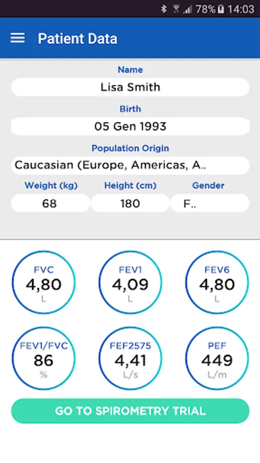 The iSpirometry system (app + device) measures FVC, FEV1, FEV6, FEV1/FVC, FEF2575 and PEF using the same exact technology currently used in the most advanced pulmonary labs worldwide.