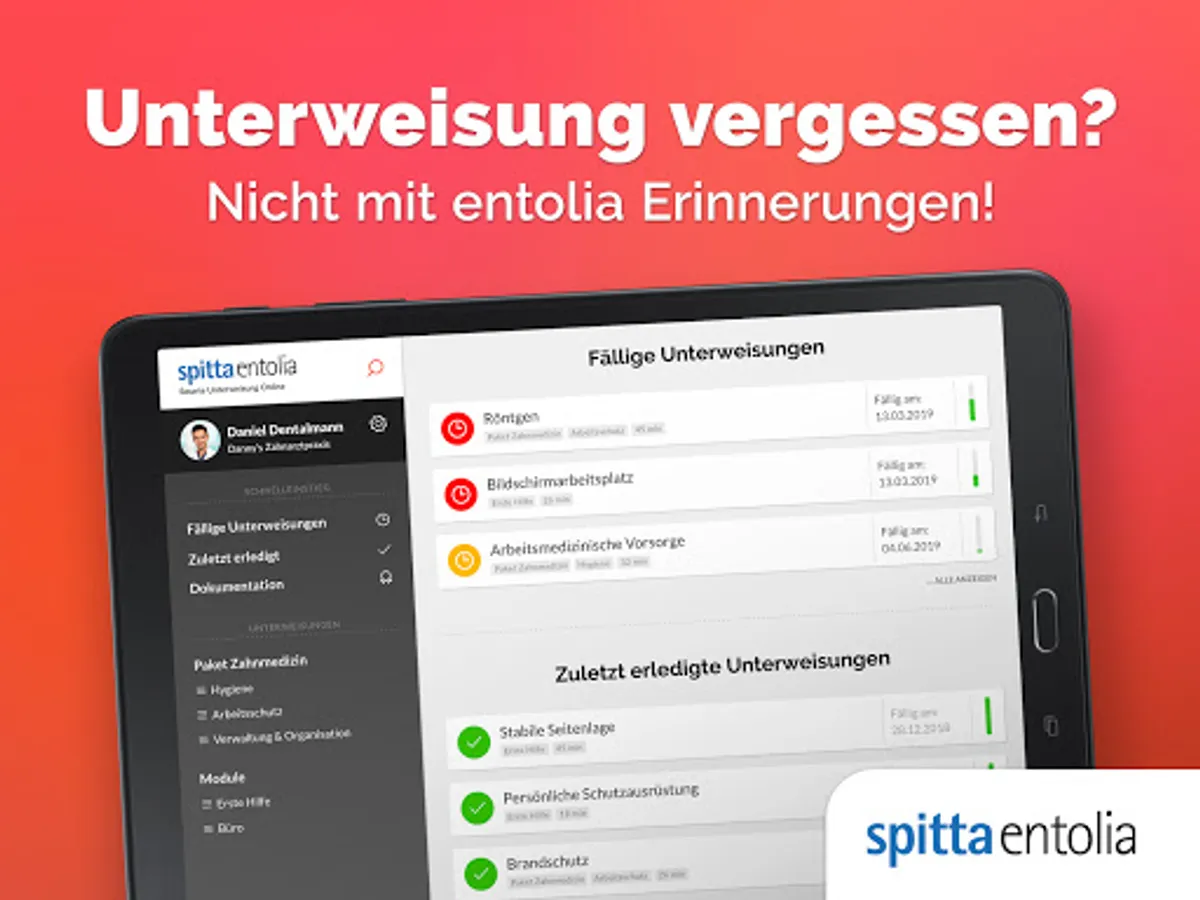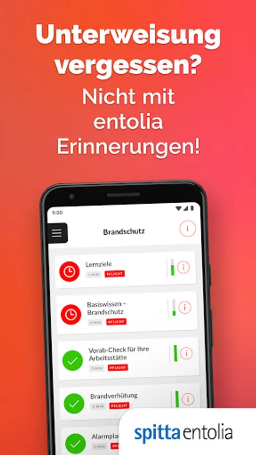 Thanks to the reminder function from entolia, instruction appointments will no longer be forgotten. Every employee is made aware in good time that the relevant instruction is being carried out. The processing status of each individual instruction can be viewed in the app at any time. Each employee can see for themselves which modules still need to be completed and which they have already completed. Here, colored markings indicate that the individual instruction modules are due.