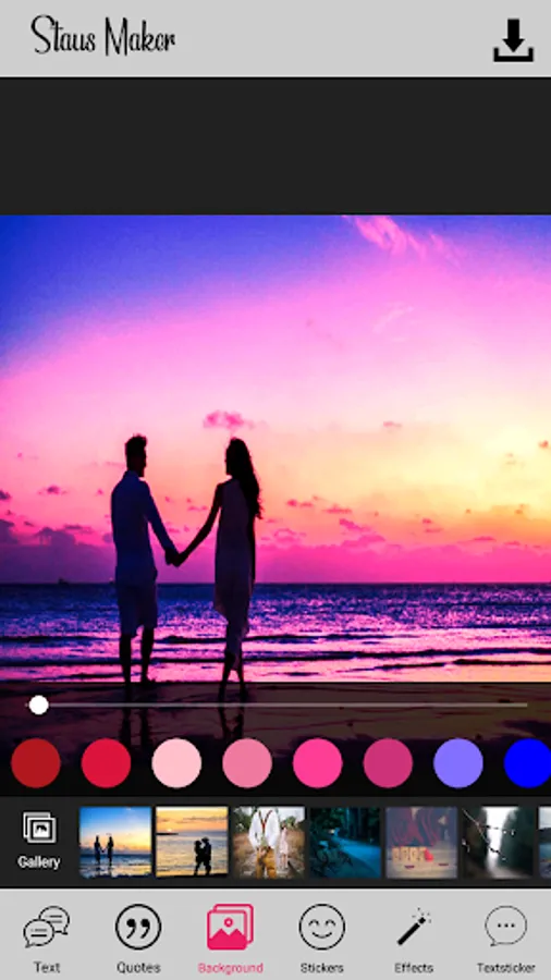 Status MakerFree app is a complete text editor which has lot of edit options such as text size, font styles, text color, shadow, text format, text alignment etc.This quotes creator contains beautiful backgrounds which you can select background which u like most and on top of it add your text background color.