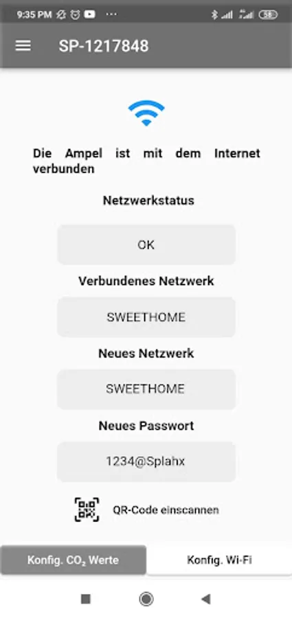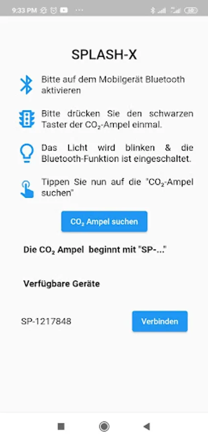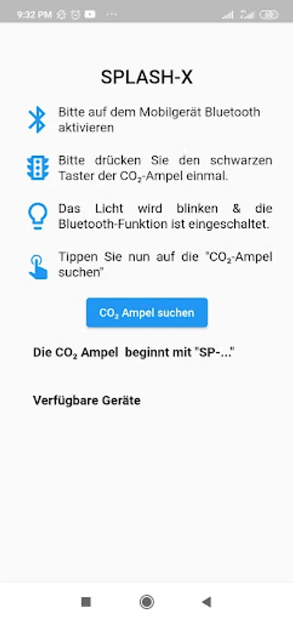 The SPLASH - X app was developed to establish a connection with the CO₂ traffic light (SPLASH -X) supplied. The app enables the user to connect to the traffic light via the Bluetooth functionality. After the connection, the user can follow the live CO₂ value in the room. In addition, the user can set different CO₂ concentrations for different lights. The WLAN connection function enables the user to connect the traffic light to the Internet in order to have the software updated regularly. The WLAN access data can be scanned with the built-in QR code scanner or entered using the keyboard. We respect the user's privacy. Therefore, the app does not collect any data from the user and does not allow advertisements to be displayed.