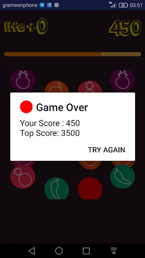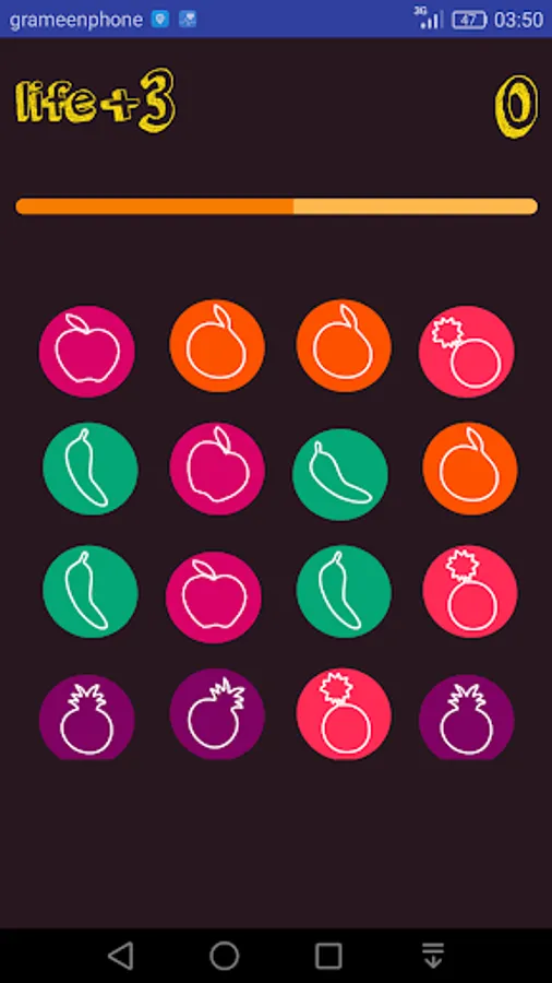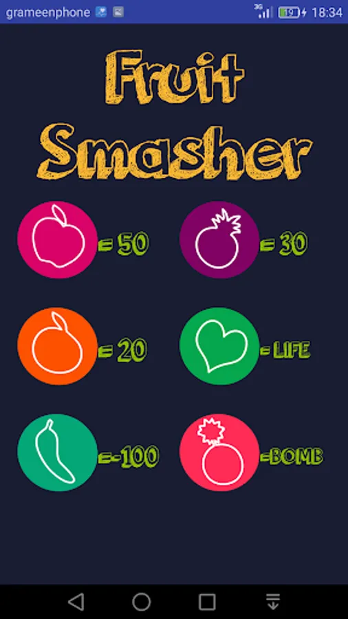 Here you need to collect fruits from some random object to get more points . Your score will increase as fast as you collect fruits. You should avoid green fruits & Bomb . As you collect green fruits you loss 100 points & If you press on Bomb You loss a life out of three .