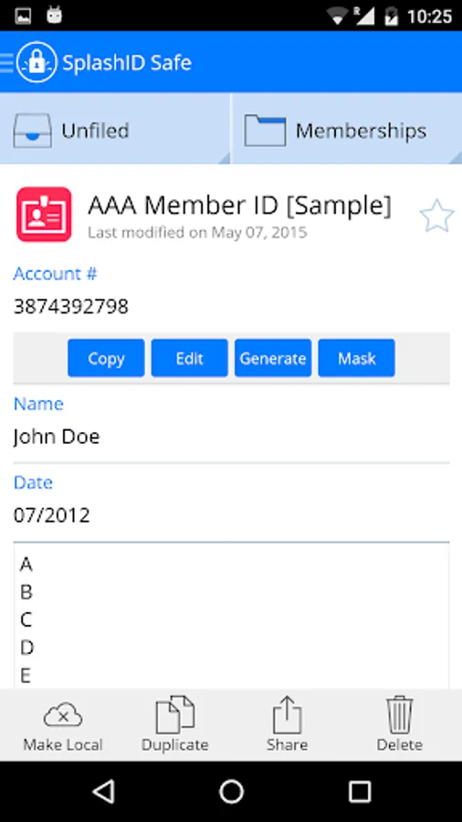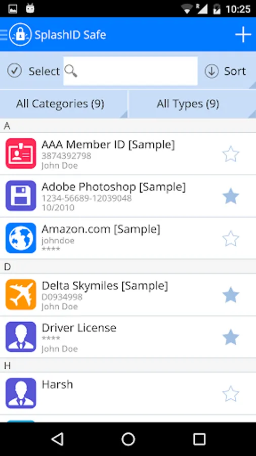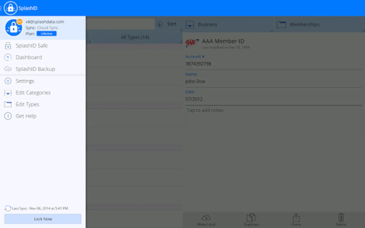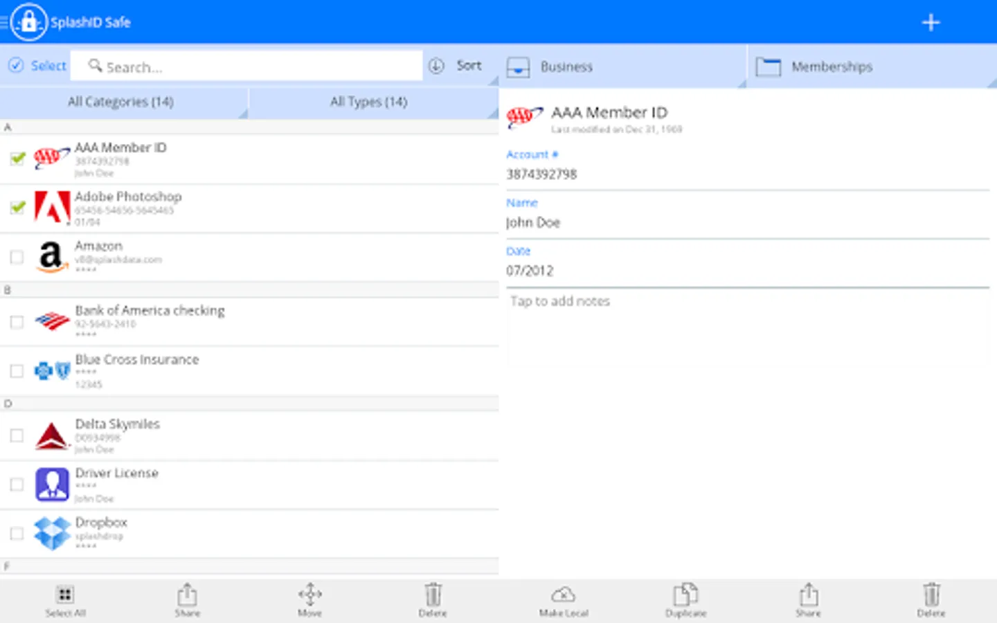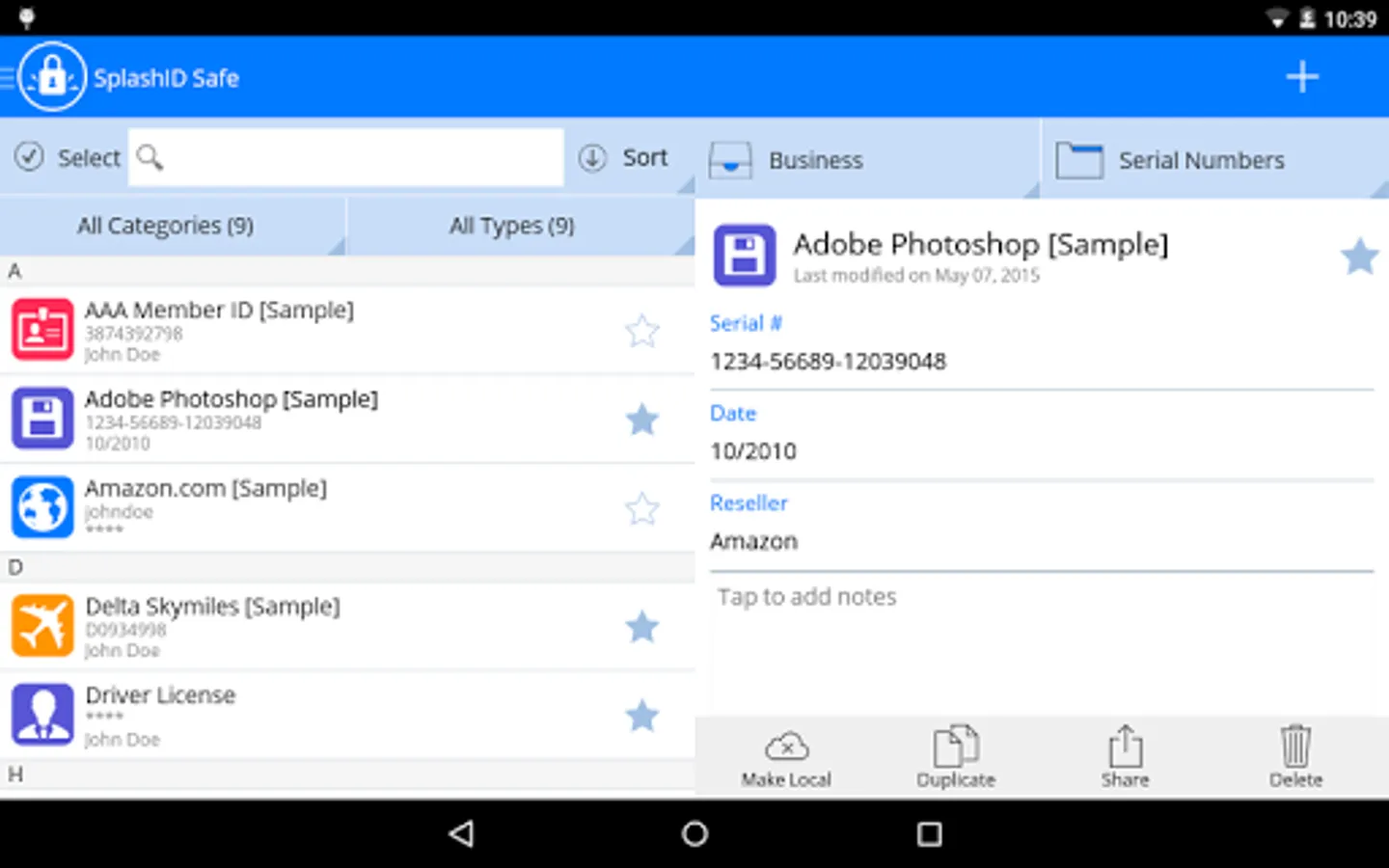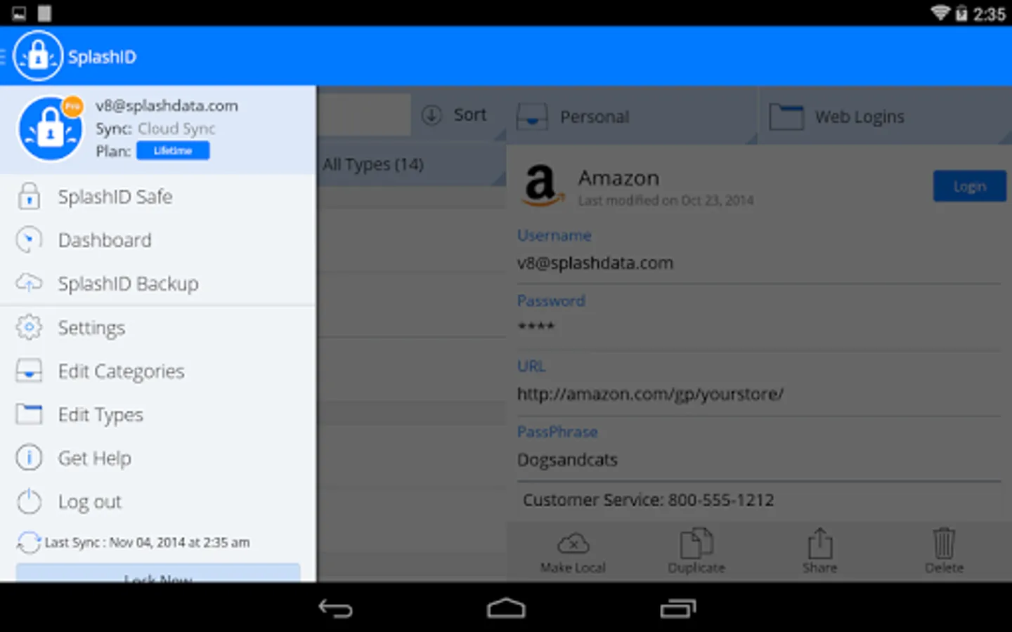 Think of SplashID as your personal vault or digital wallet on Android. You can store and lock sensitive information - not just usernames and passwords but credit card data, account numbers, registration codes, prescriptions, and much more.